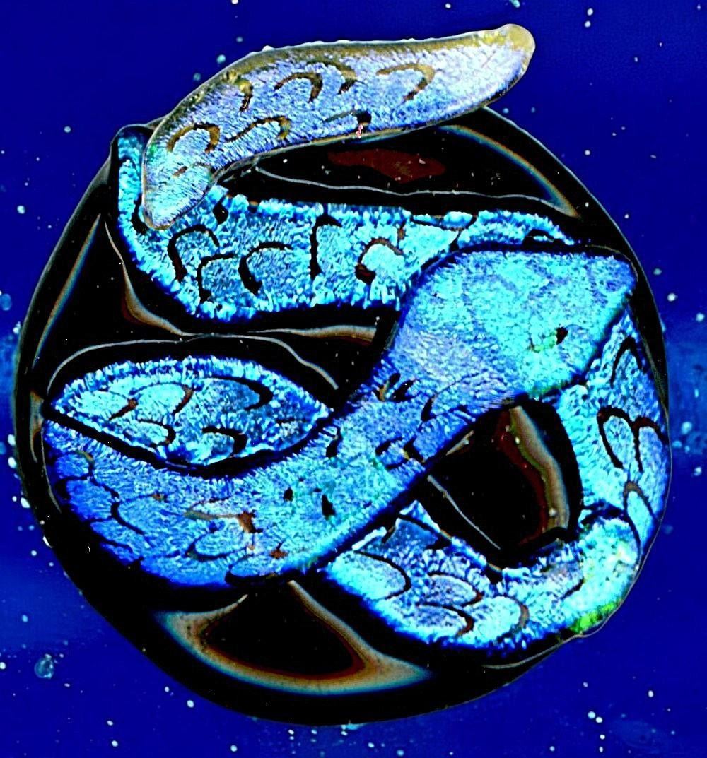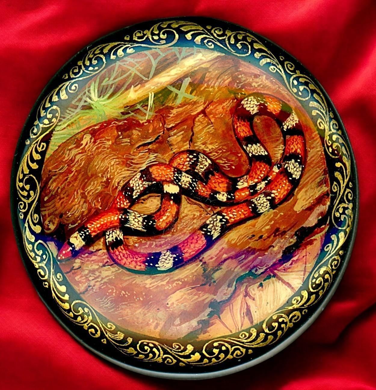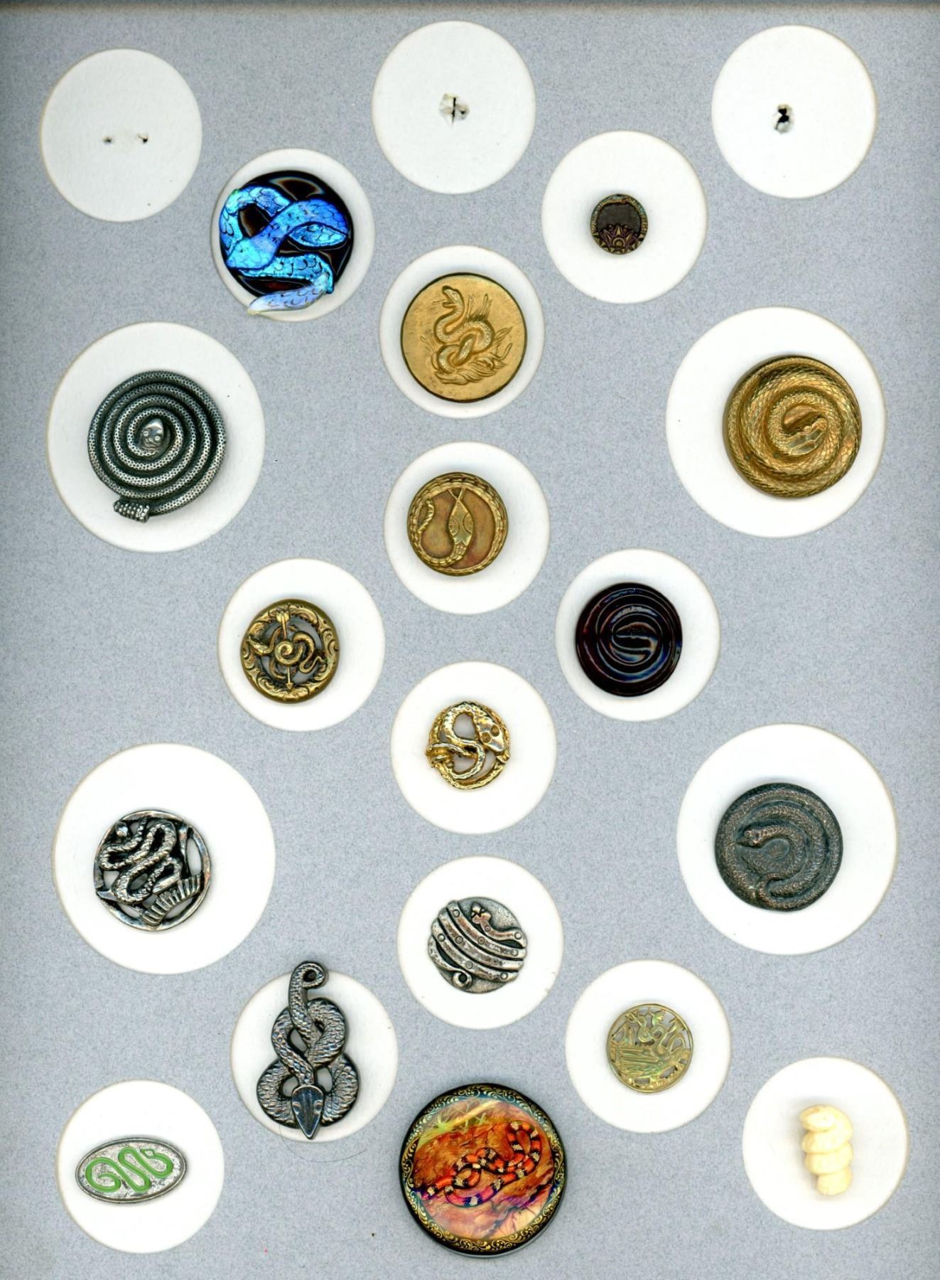 17 S/M/L 19th/20th century assorted mode examples. This card includes several nice examples including the large Russian lacquer, realistic coiled bone snake, several nice metal examples, the nice black and blue glass dichroic lampwork and more.