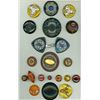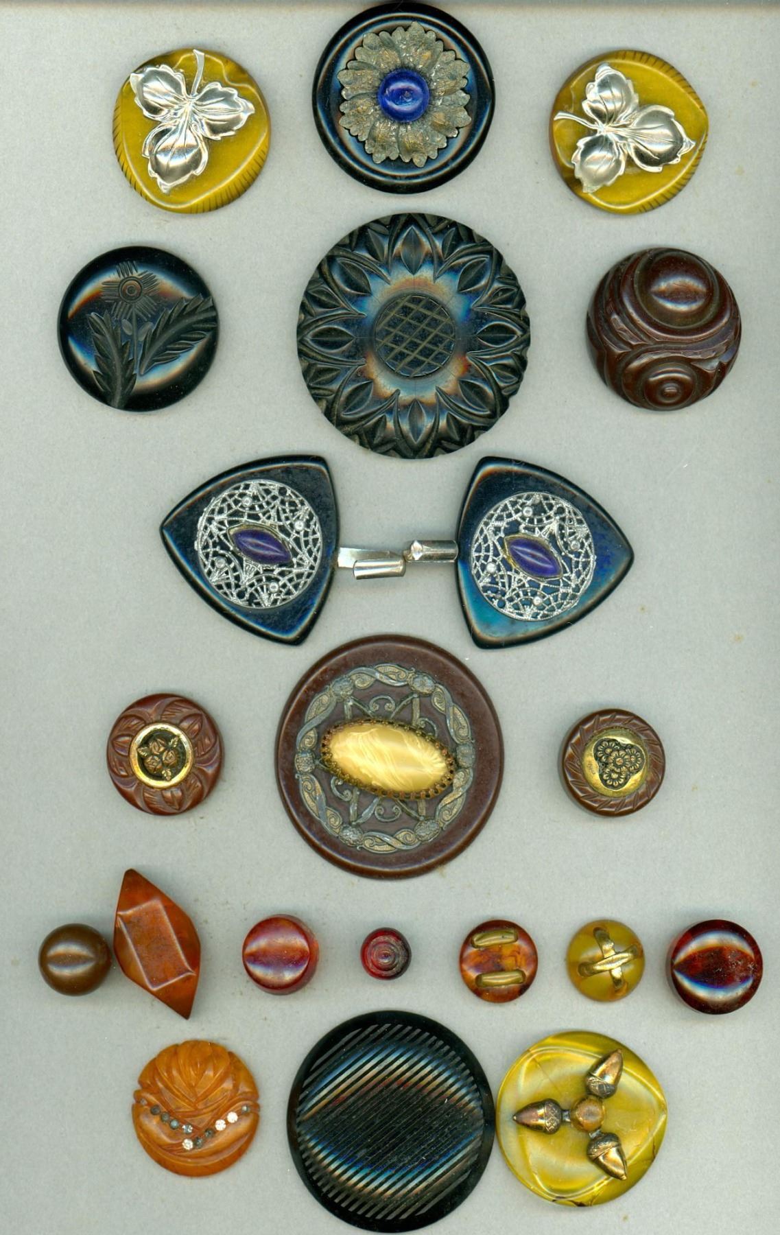 19 S/M/L 20th century examples plus a 2 piece buckle. This lot includes glass jeweled examples, pictorial metal escutcheons, carved and more.