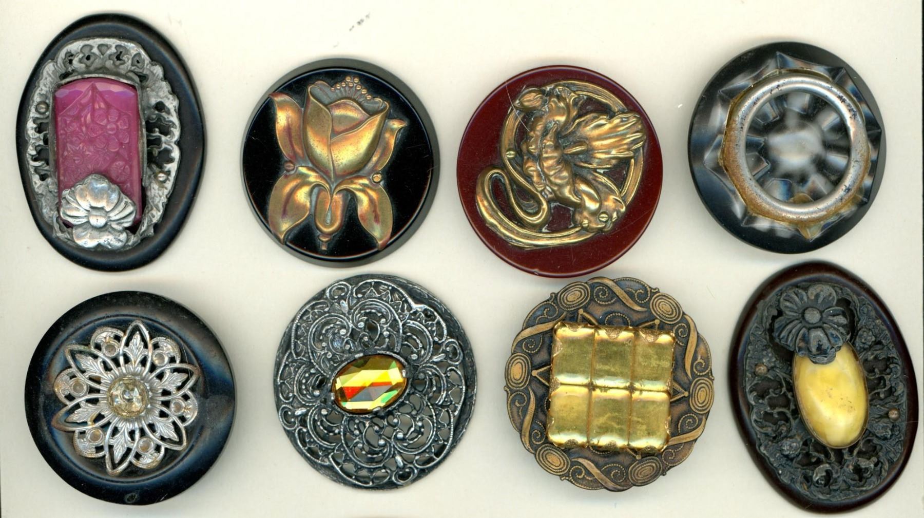 8 Large 20th century examples including Bakelite. This card of Connie Robinsons includes several nice Bakelite coat jeweled buttons along with a variety of colored glass centers as well as a couple of nice brass flower escutcheons on Bakelite and more..