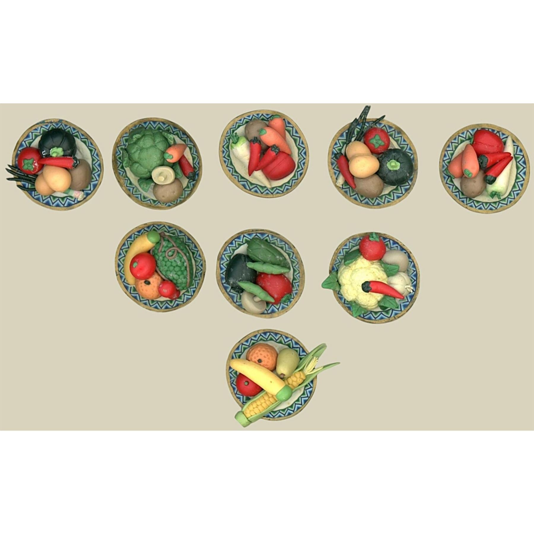 9 Large 20th century colorful examples. We are not sure who made these buttons but the consignor Jose Roman sure loved them enough to have a large variety of them. They are beautifully made and quite colorful as well. The base is designed like a plate and the plate has fruit or vegetables on them. They appear to be made of some sort of clay. Great craftsmanship whover the artist or maker was. Very nice.