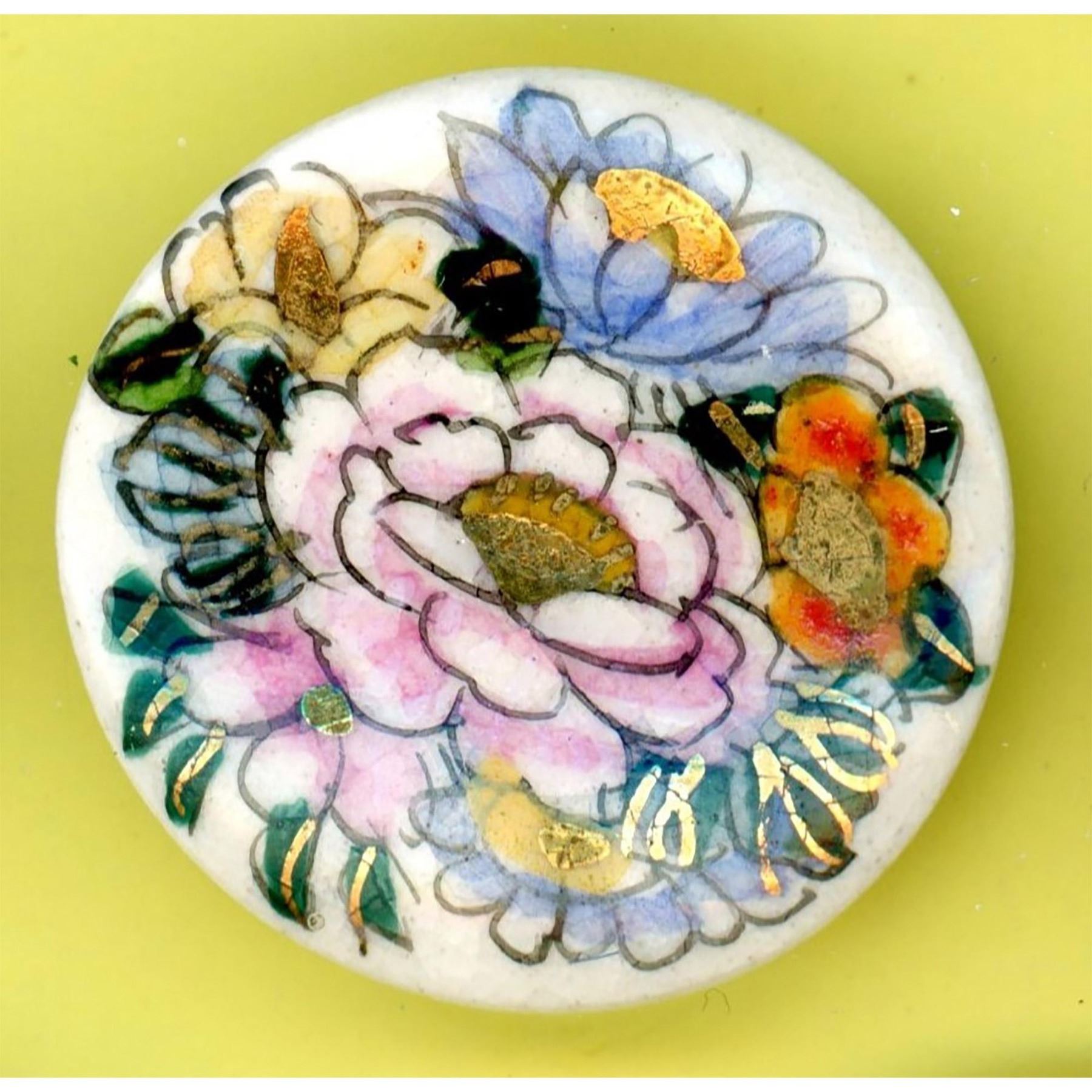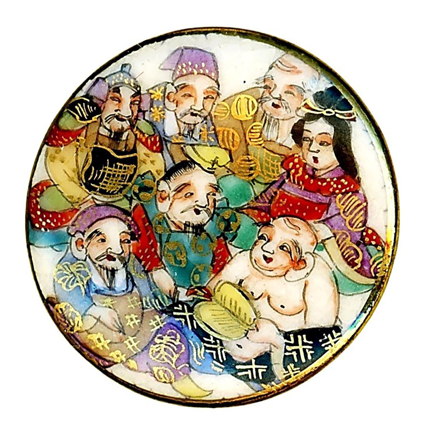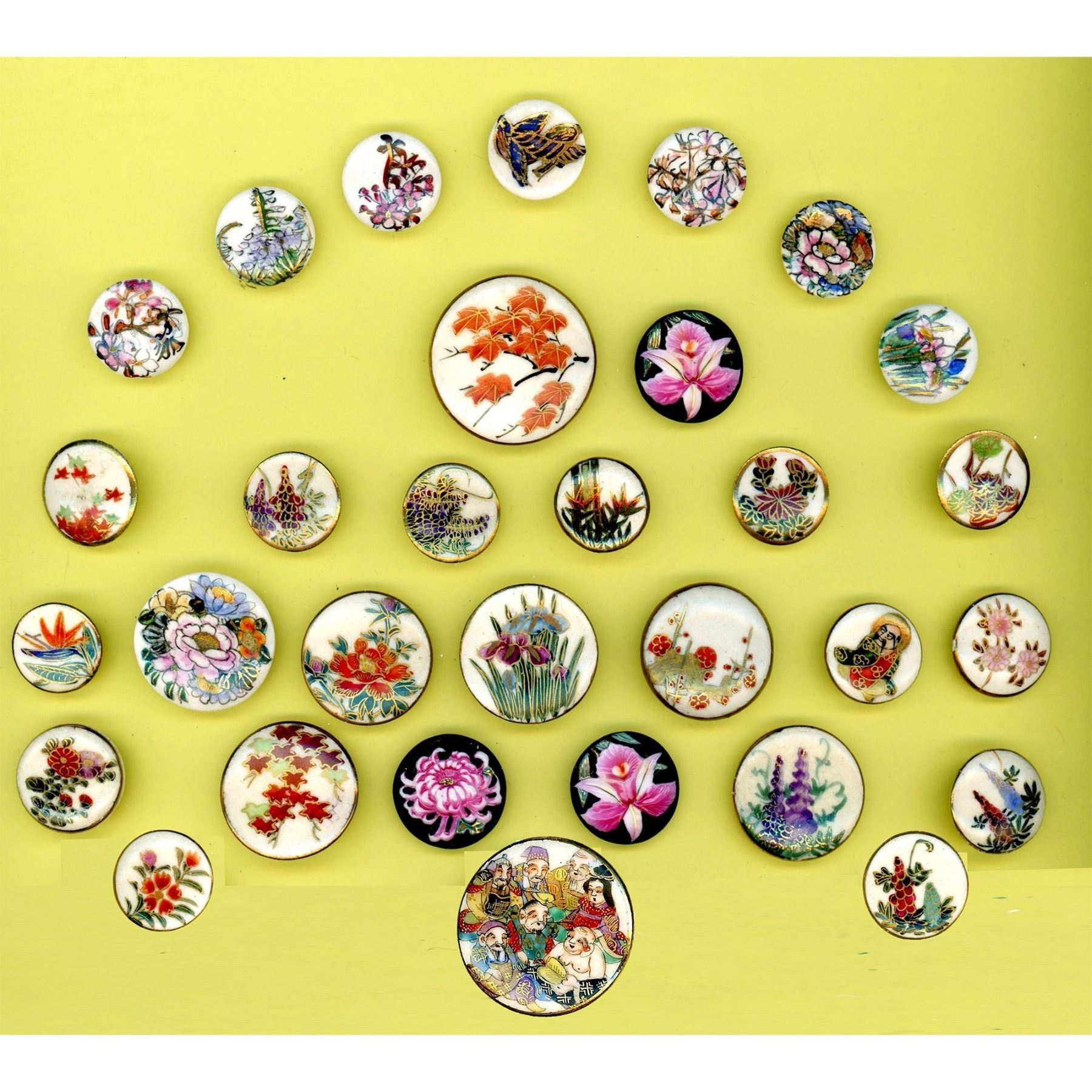 31 Small/Medium 20th century pictorial Japanese ceramic buttons. Here is a nice card of Japanese ceramics, mostly Satsuma pottery along with three nice black background Arita porcelain buttons. The lot includes a larger medium depicting the 7 Gods on one button.