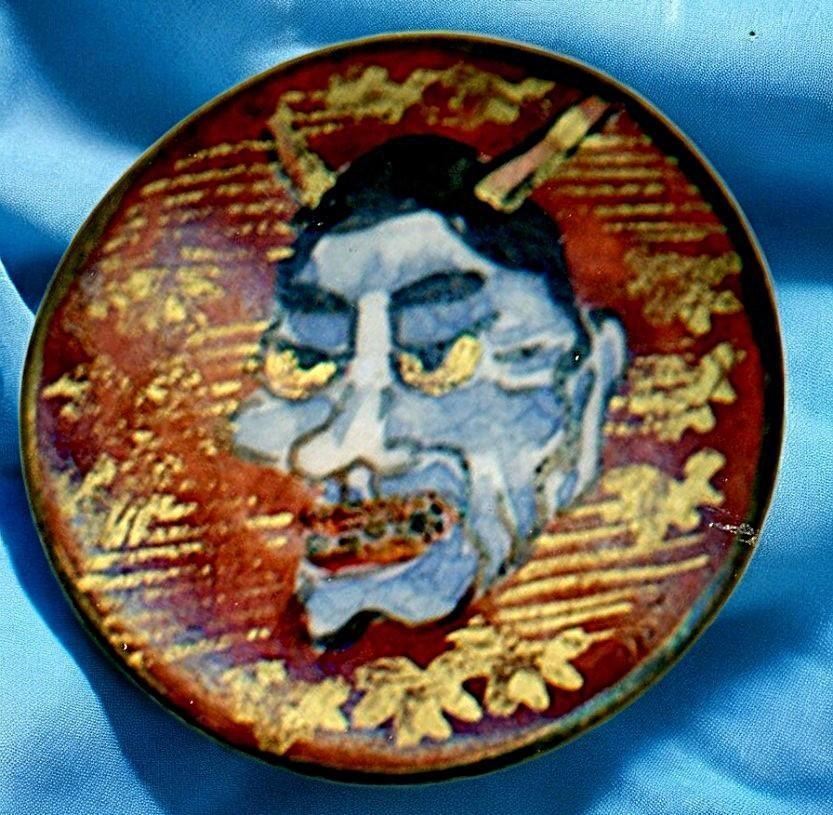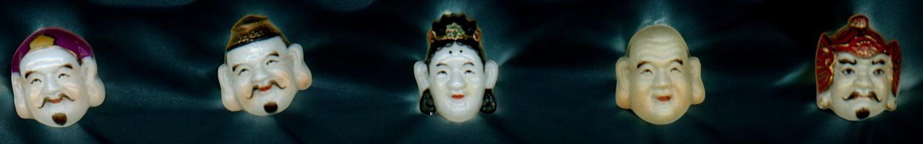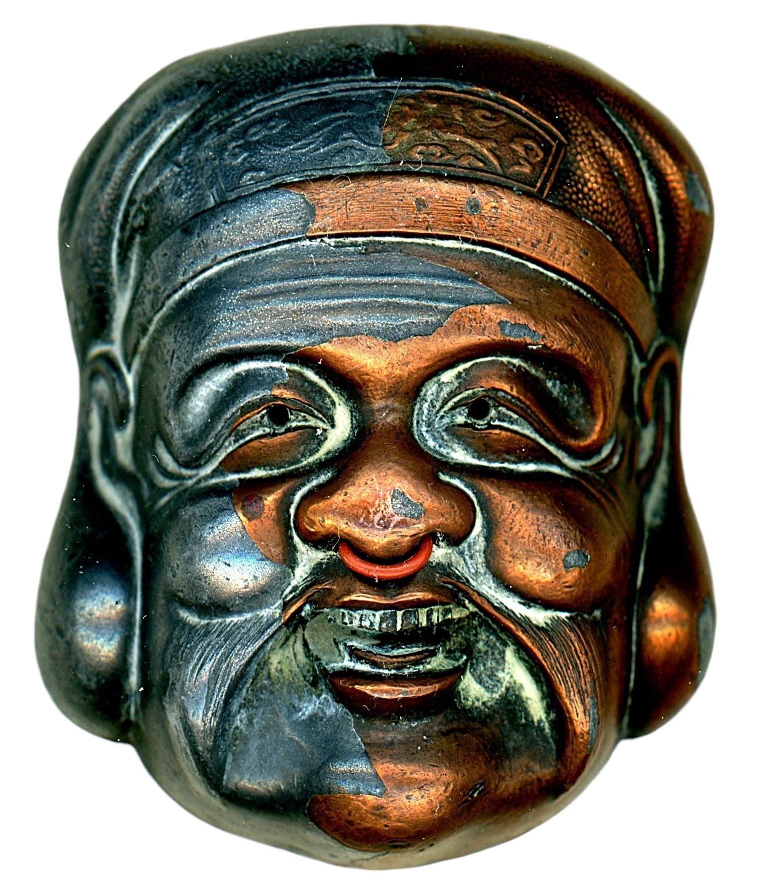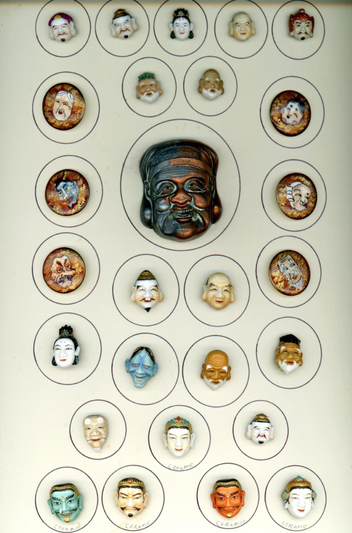 27 S/M/L 20th century examples of Arita and Satsuma sets. Here is an incredible opportunity as these sets are typically sold individually, but we decided to keep this card intact, so you get 3 sets of Japanese Arita porcelain gods and masks along with a set of Satsuma masks, The lot also includes a wonderful detailed copper realistic high relief mask in the center of the card.