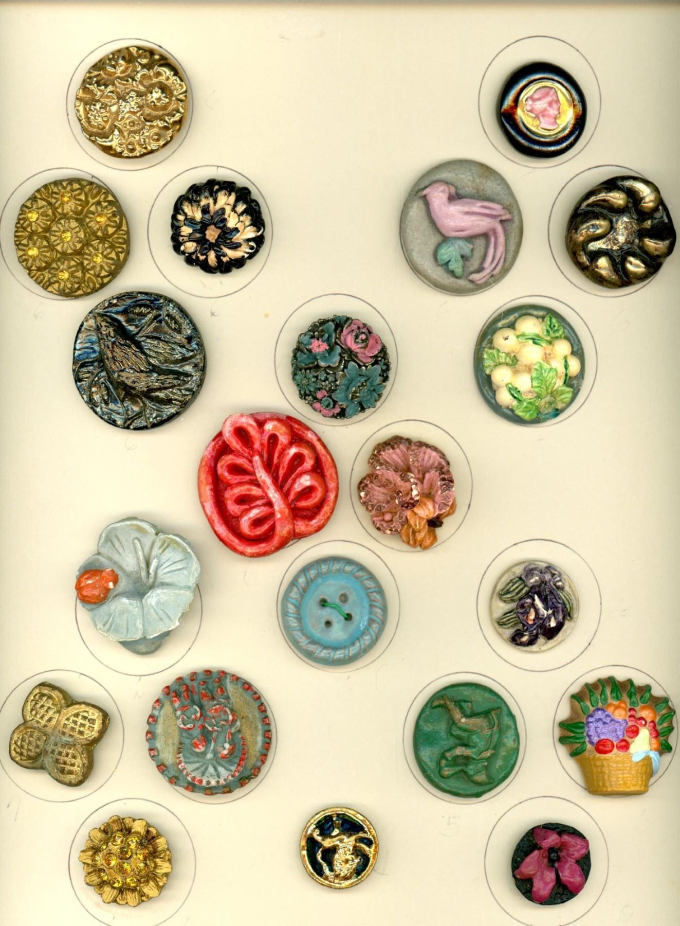21 Medium/Large 20th century specialized to acrylic shot. Here is a card you don?t see come up every day. A large selection of these now desirable Acrylic shot buttons in patterns and pictorials. Connie Robinson of Florida loved these.