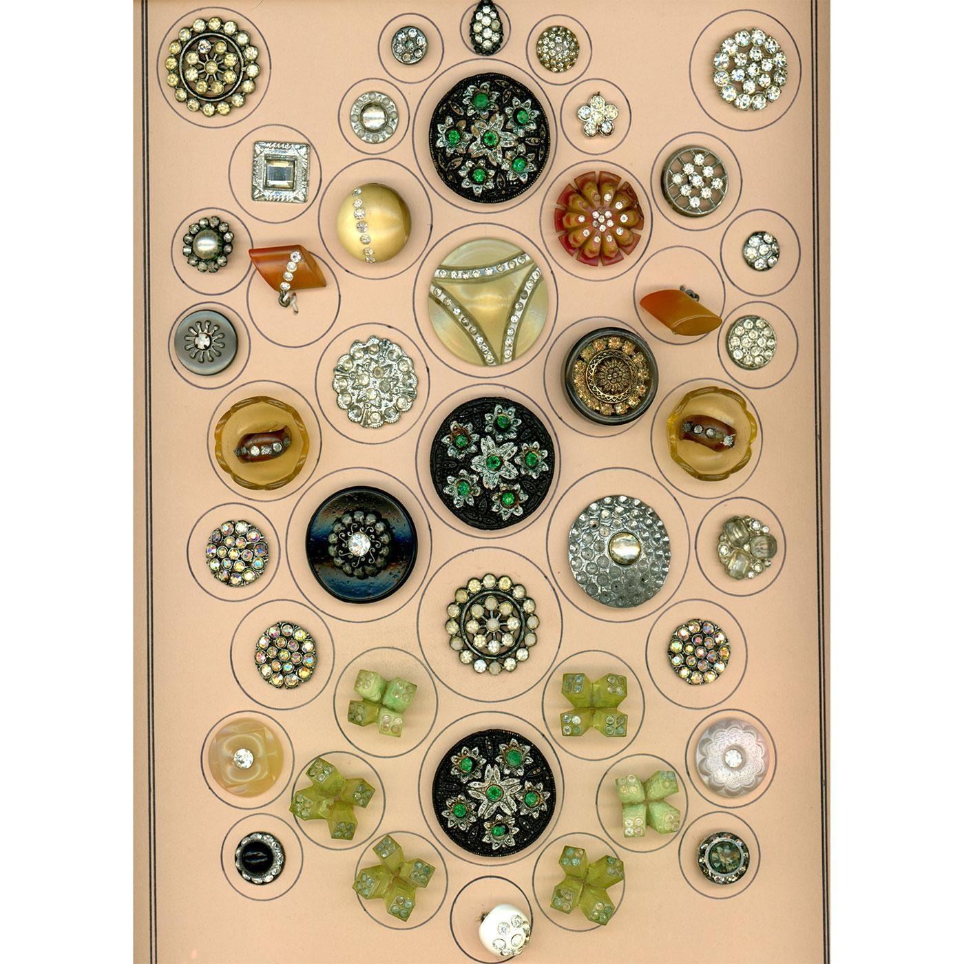 43 Small/Medium/Large 20th century assorted examples. Here is a card of assorted paste jeweled set plastics including celluloid. The lot includes an assortement of shapes and sizes all with clear paste jewels and a few with colored paste examples/ From the collection of Jose Roman. Placed in a standard wood button frame and already to hang on your wall.
