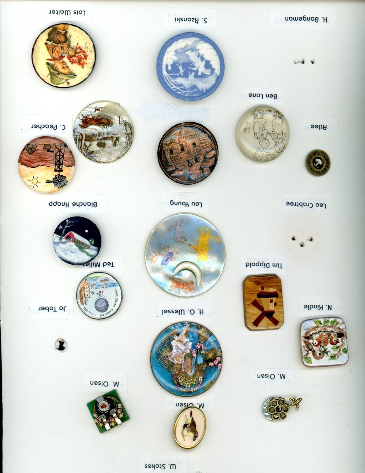 16 S/M/L 20th century assorted material examples. Here is a card of some wonderful studio artist buttons including a hand colored Hot air balloon by Ted Miller, a noce example of the late Ben langs work, Syella Rxanski, Ralph Briggs, Bobbie Olson, a great pearl by Lou Young, a njce marqutry by Tim Dipold, a nice waycg crystal by Harry Wessel and much more.
