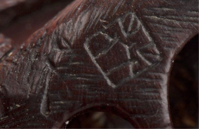 Late Miwa, Tokyo, Late 18th/early 19th cent , Late 18th / early 19th century. The Nuye's stripes are carved in ukibori and several teeth are inlaid in ivory, signed on bottom with kakihan only 1 1/4in (3.1cm).