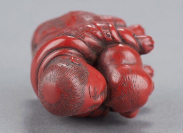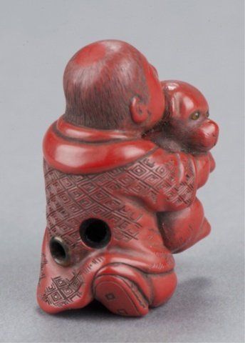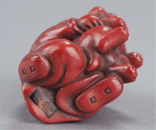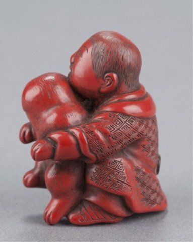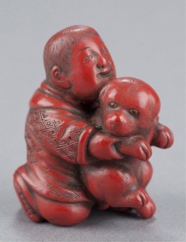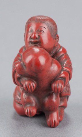 By Ryykusai Jugyoku 2nd, Tokyo, Late 19th century. , Late 19th century. He holds up the puppy in front of him, his hands grasped around its front paws. The eyes of the puppy are inlaid in pale horn with black pupils. Signed on the underside in an inlaid tortoise-shell tablet, Jugyoku. 1 5/8in (4.3cm). Provenance: Purchased from Sydney L. Moss, Ltd, London, 1982. Illustrated with a drawing in the MCI on page 273.