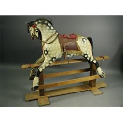 A carved wooden rocking horse, circa 1950's with a horse hair main and tail, on static testle roc...