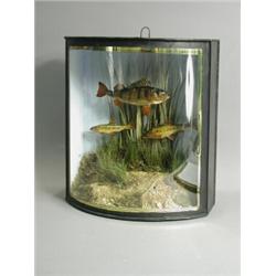 A case of three small fish with bow glass, 'Birmingham Waterways, November 1937', 35cm high Est. 200/250