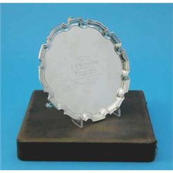 A cased George VI silver salver, with pie crust border on three scroll feet, Birmingham, 1948 11oz, 8ins £70-100