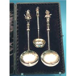 A cased set of 2 Victorian novelty silver serving spoons and a matching sifter ladle, the finials cast as Mr Punch, Judy and Toby, makers Horace Woodward and Co. Ltd. 1889 £300-400