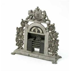 A cast iron door stop, in the form of a fire place, painted silver and surmounted with a coat of arms, 12ins £100-150