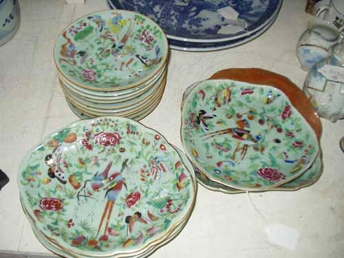 A celadon-glazed 16-piece dessert service with polychrome floral and exotic bird design. £200-300