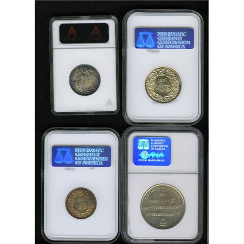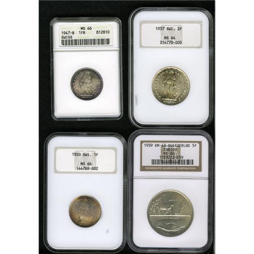 <B>A certified quartet including:</B></I> 1 Franc 1947B, MS66 ANACS, nice peripheral toning; 1 Franc 1920B, MS66 NGC, 2 Francs 1937B, MS64 NGC; and a 5 Franc Zurich 1939, KM43, MS66 NGC.