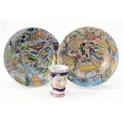 A character mug in the form of Bacchus, decorated with vines and fruit with pink and gilt borders and a pair of Delft plates painted with birds and animals, 4" £70-100