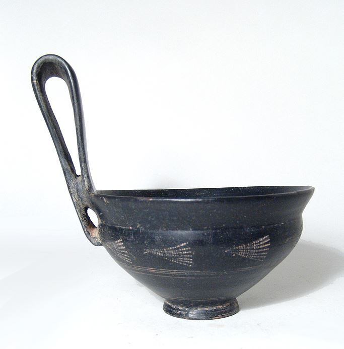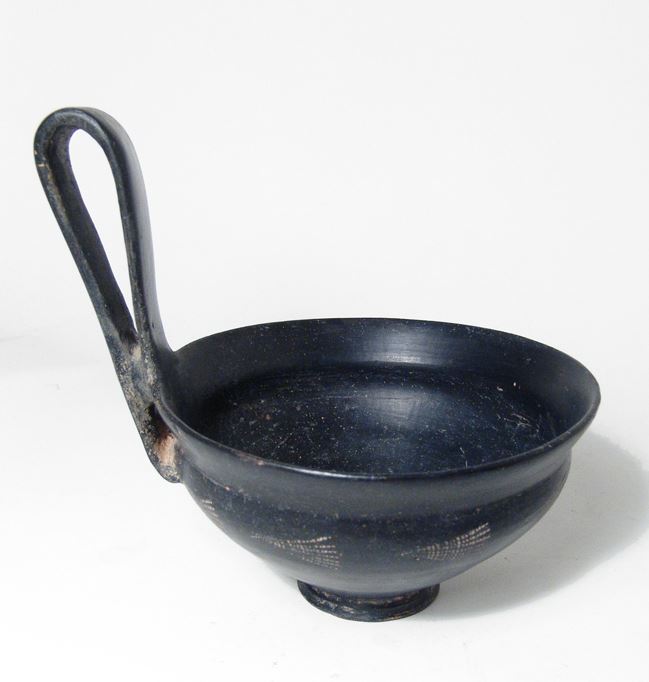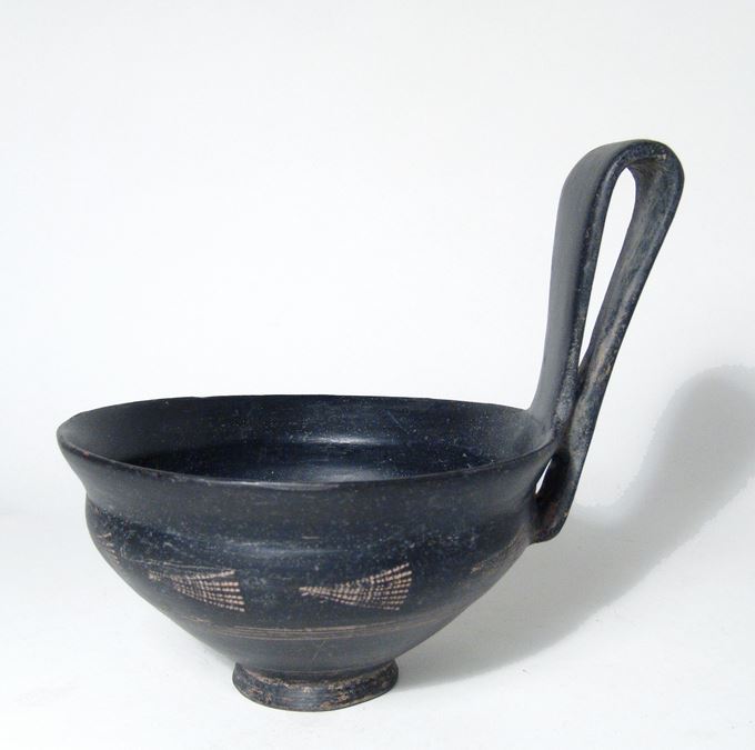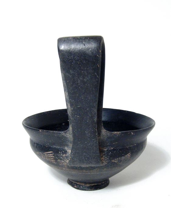 A choice Etruscan Bucchero Kyathos, Italic, c. 6th Century BC, the bowl tapering to a small flared foot, the outside decorated with impressed palmettes, the vertical handle is tall and wide. A handsome example in a superb state of preservation with high gloss burnished surfaces. H: 6 ¼ in (15.8 cm). Ex Southern California private collection.