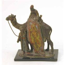 A cold painted spelter table lighter, modelled as a carpet seller upon a camel, 7ins £150-200
