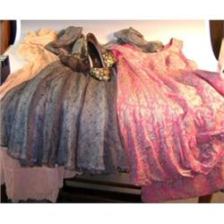 A collection of 1950's Lady's clothing, to include: a pair of Harrods shoes, a size 14 grey lace and turquoise silk dress, a pink and silver thread dress designed by Fannechi for Debenham and Freebody, a pink silk nightdress and padded dressing gown (6) £40-60