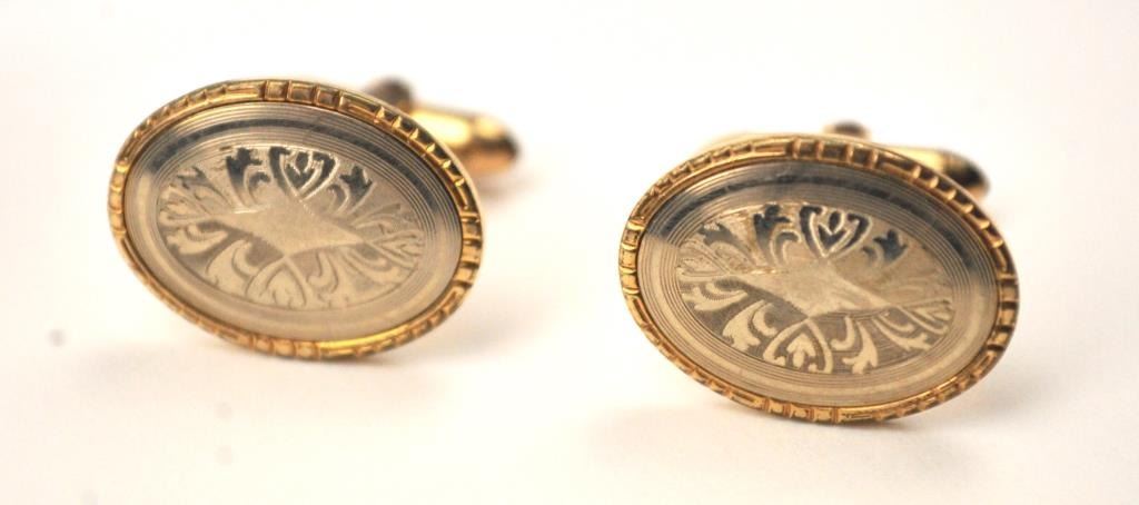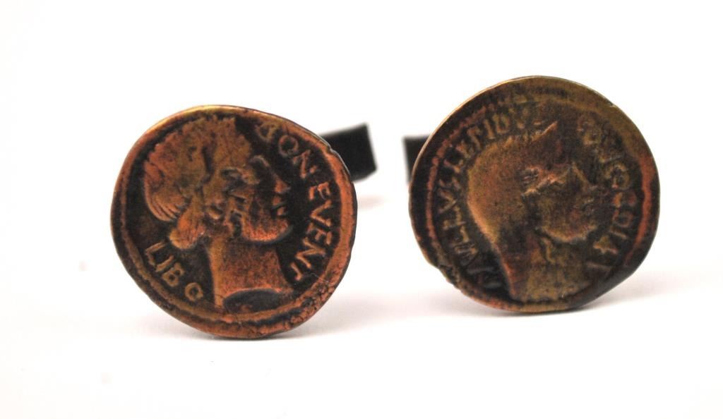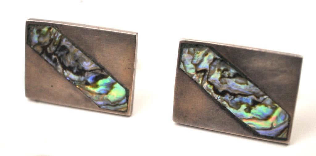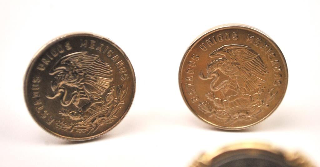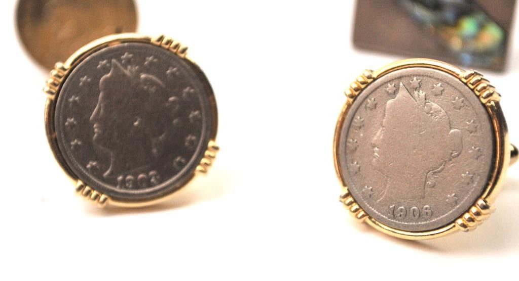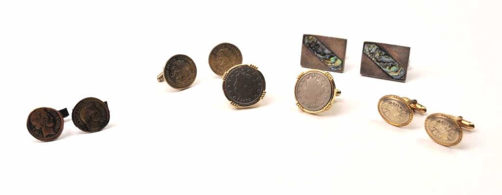 A collection of 5 pairs of custom hand made cuff links, pair of Alexander coins, pair of silver quarters, pair of 5 centavos, abalone on silver , and one pair engraved oval.Est:$175-350