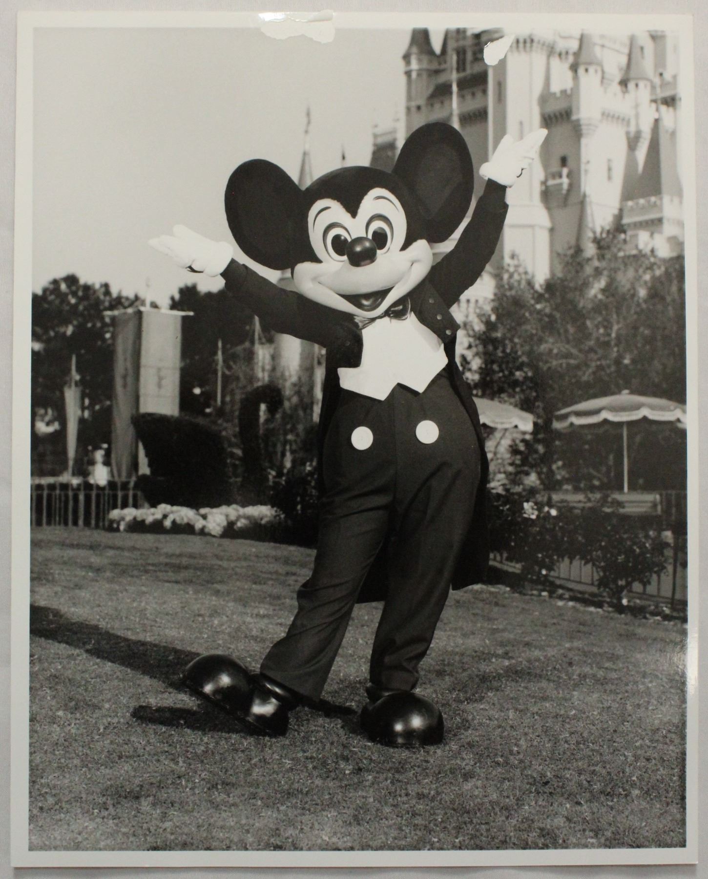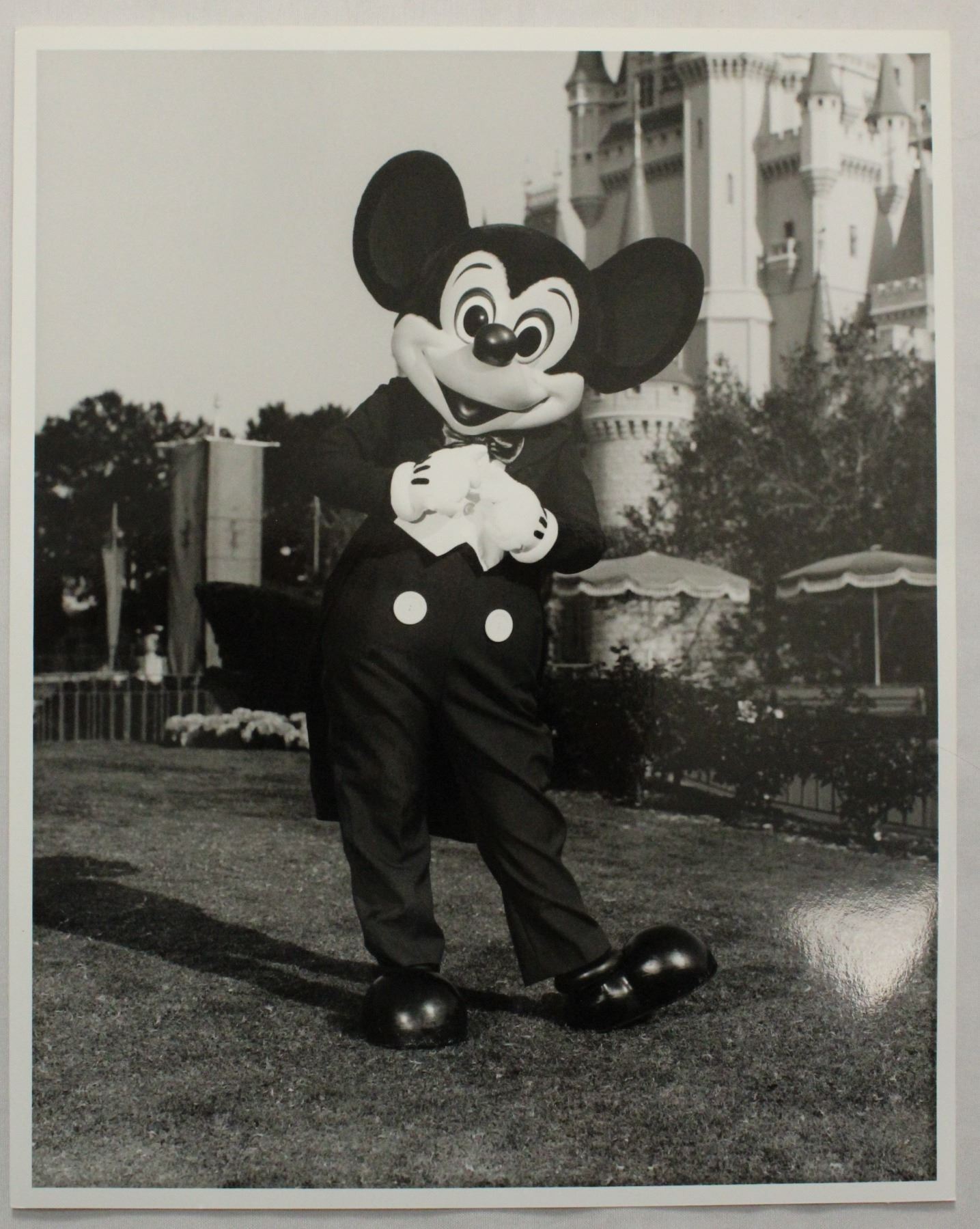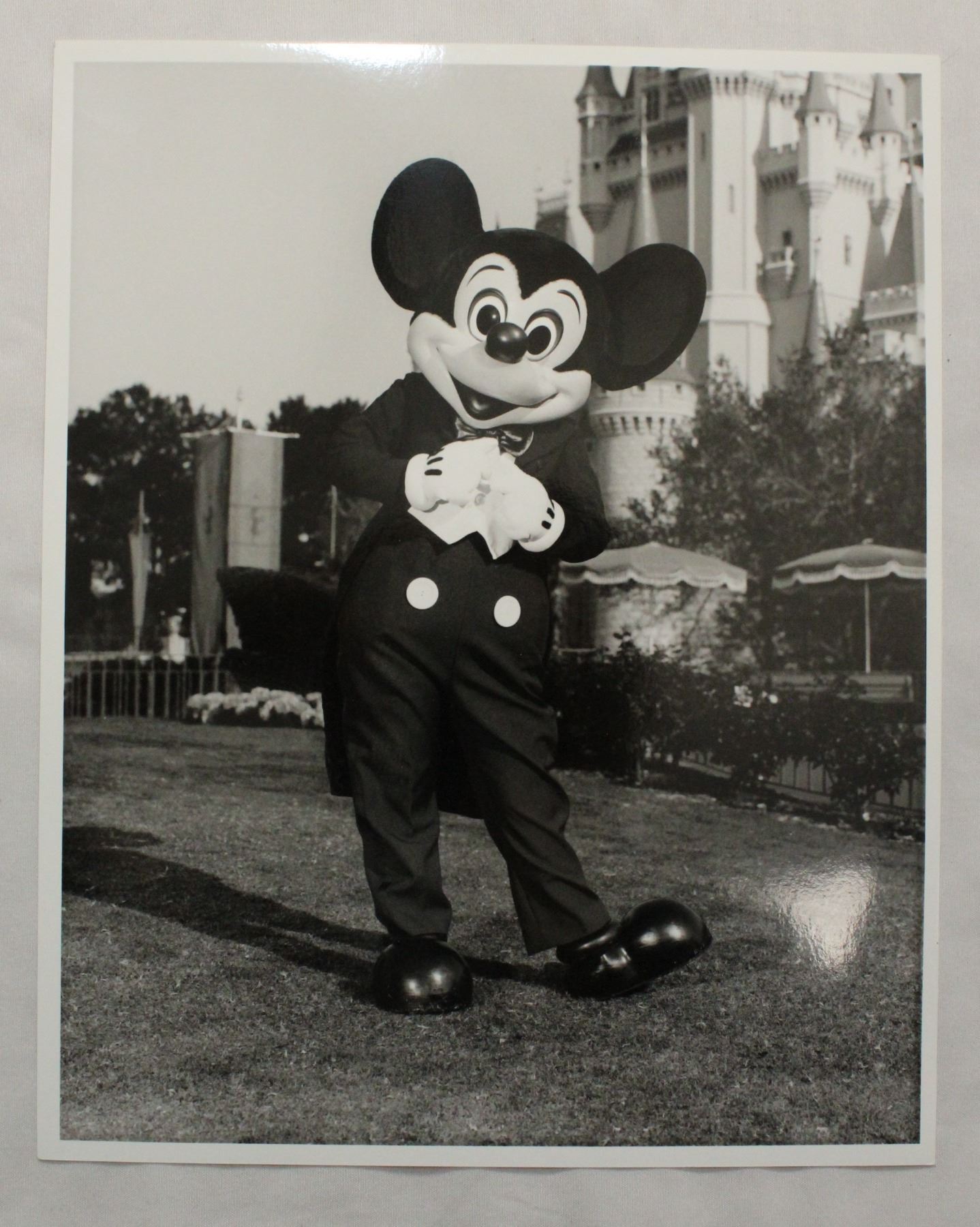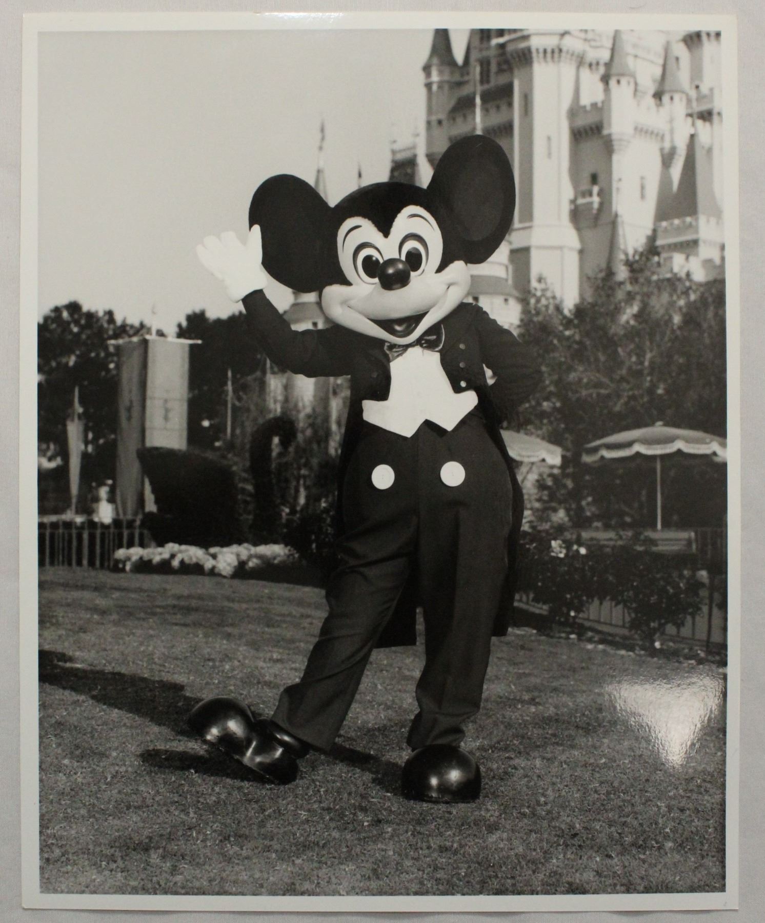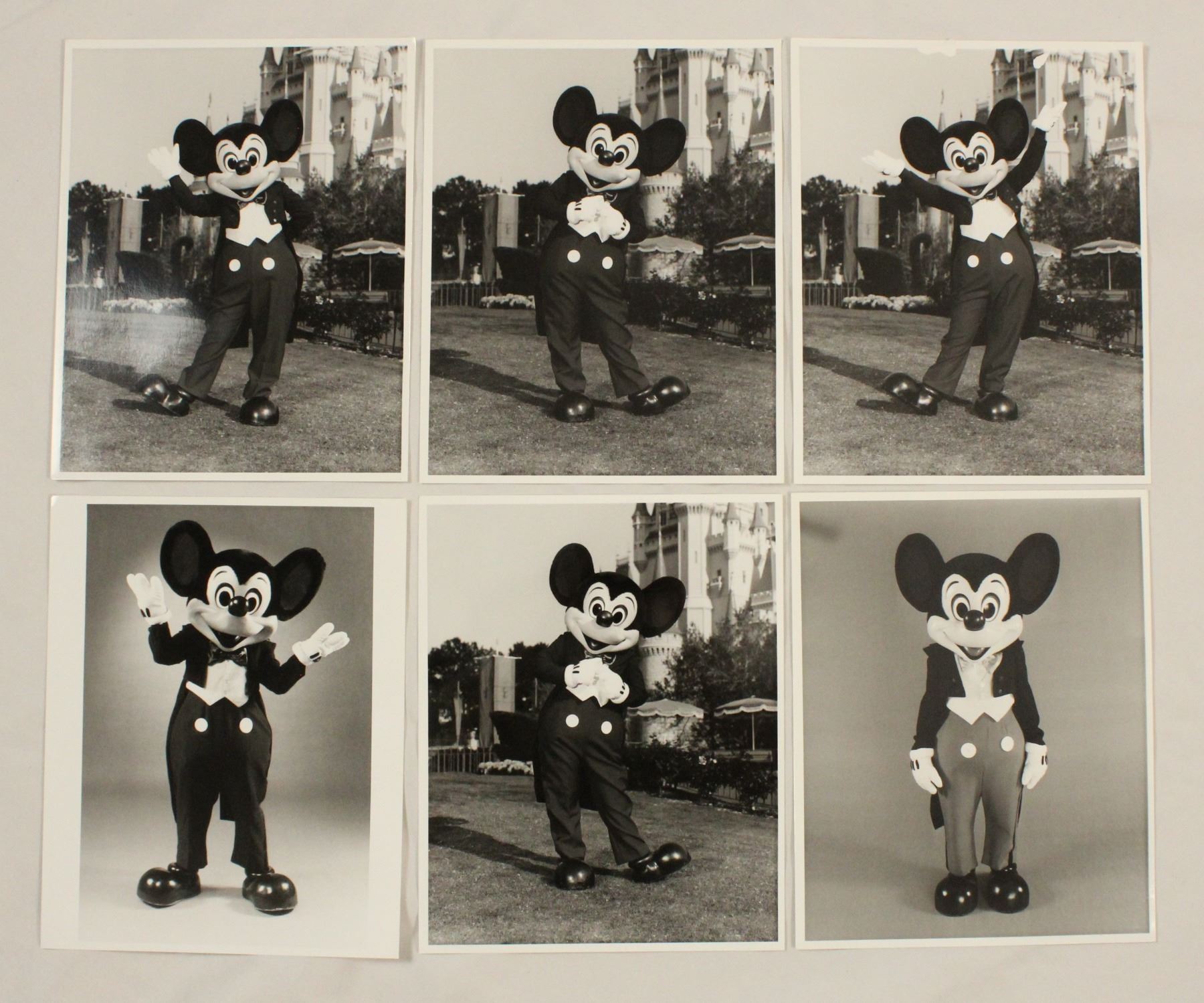 (Disney, 1987) This is a set of 6 press photos of the world's most famous mouse, Mickey Mouse. Each photo features Mickey in a different pose, with four being on the lawn next to one of the theme park castles. The back includes the inscription "Permission is granted to magazines and newspapers to reproduce this picture on condition that it is accompanied by "1987 The Walt Disney Company". All but one photo is in near mint condition measuring 8" x 10".