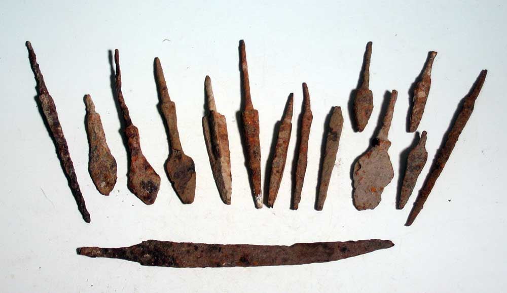 A collection of Bactrian projectile points, c. 600 - 200 BC. The 14 iron examples range from 2 in to 4-1/2 in in length and consist of a variety of forms. Also included with the group is a 6-1/2 in long iron blade. Ex Khan estate.