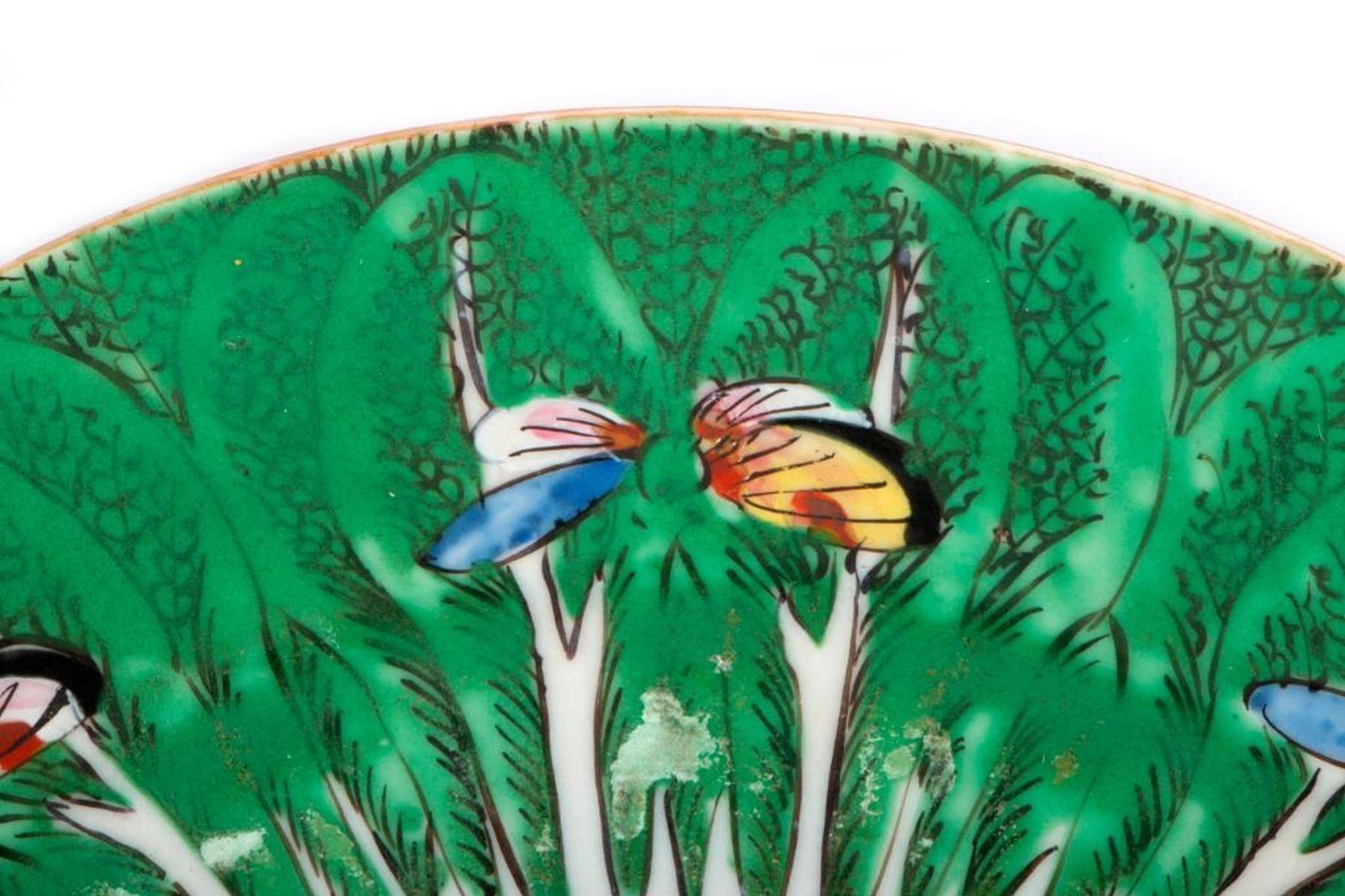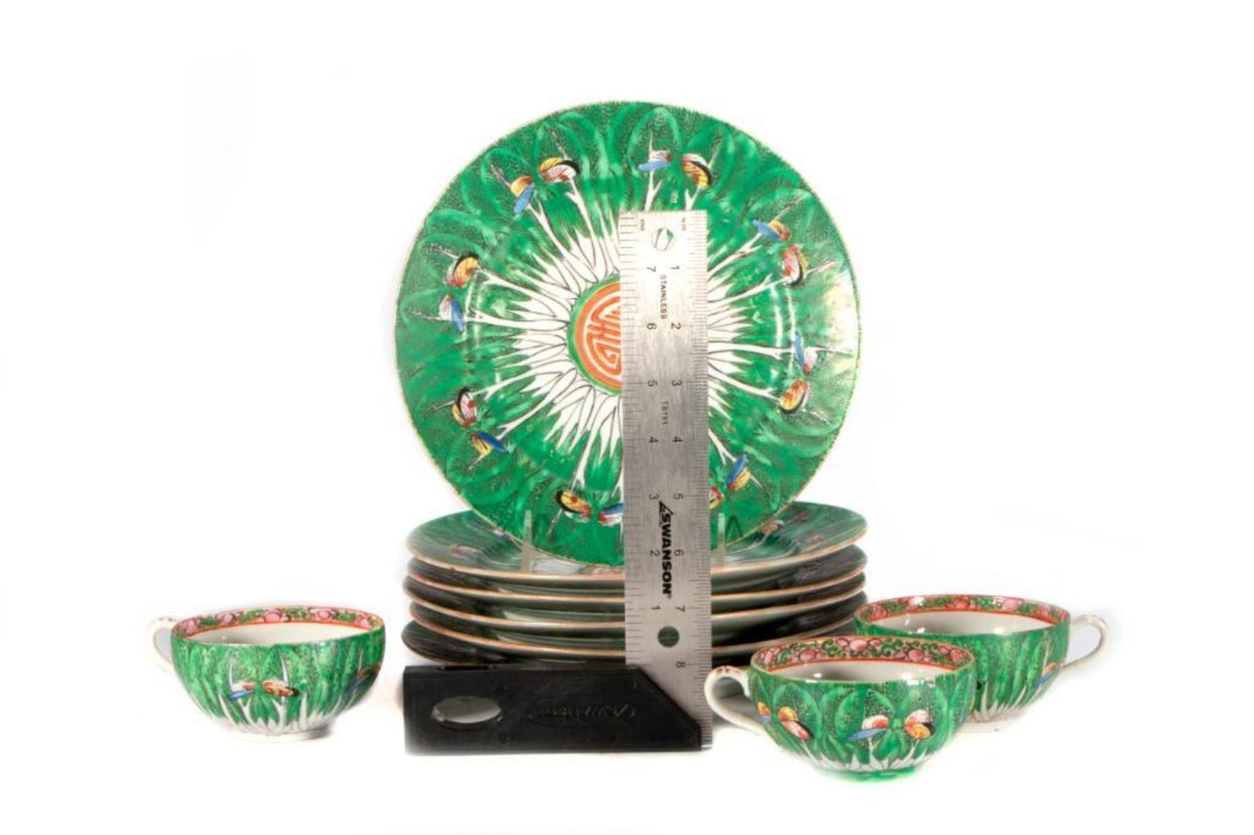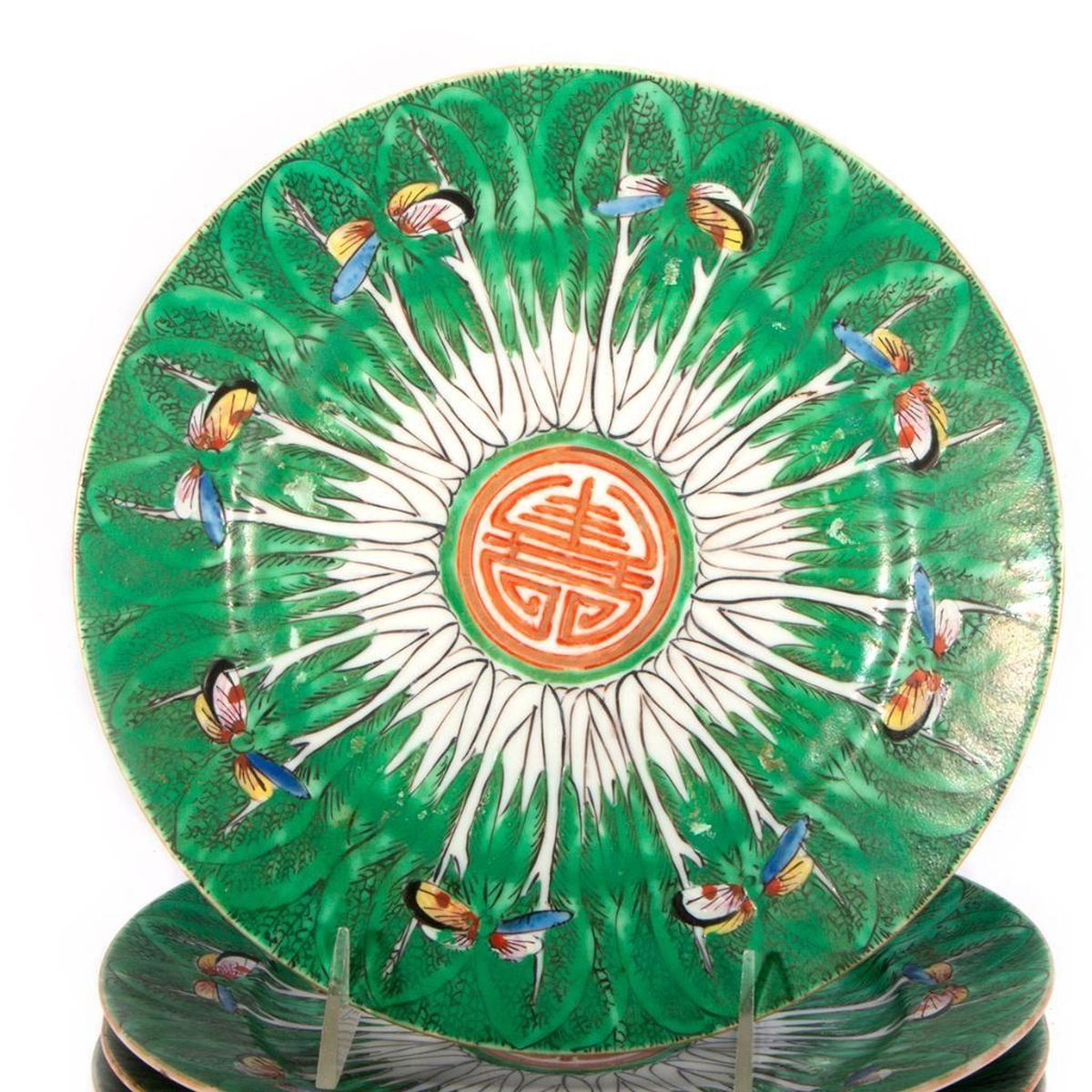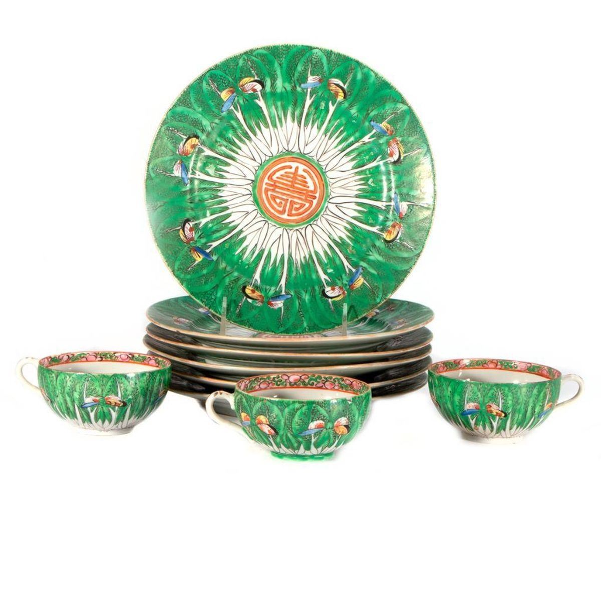 Eight late 19th /early 20th century Famille Verte butterfly pattern Chinese porcelain including six 9 inch plates and two teacups.