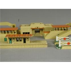 A collection of Hornby Dublo die cast Art Deco station buildings, signal boxes, level crossings,...