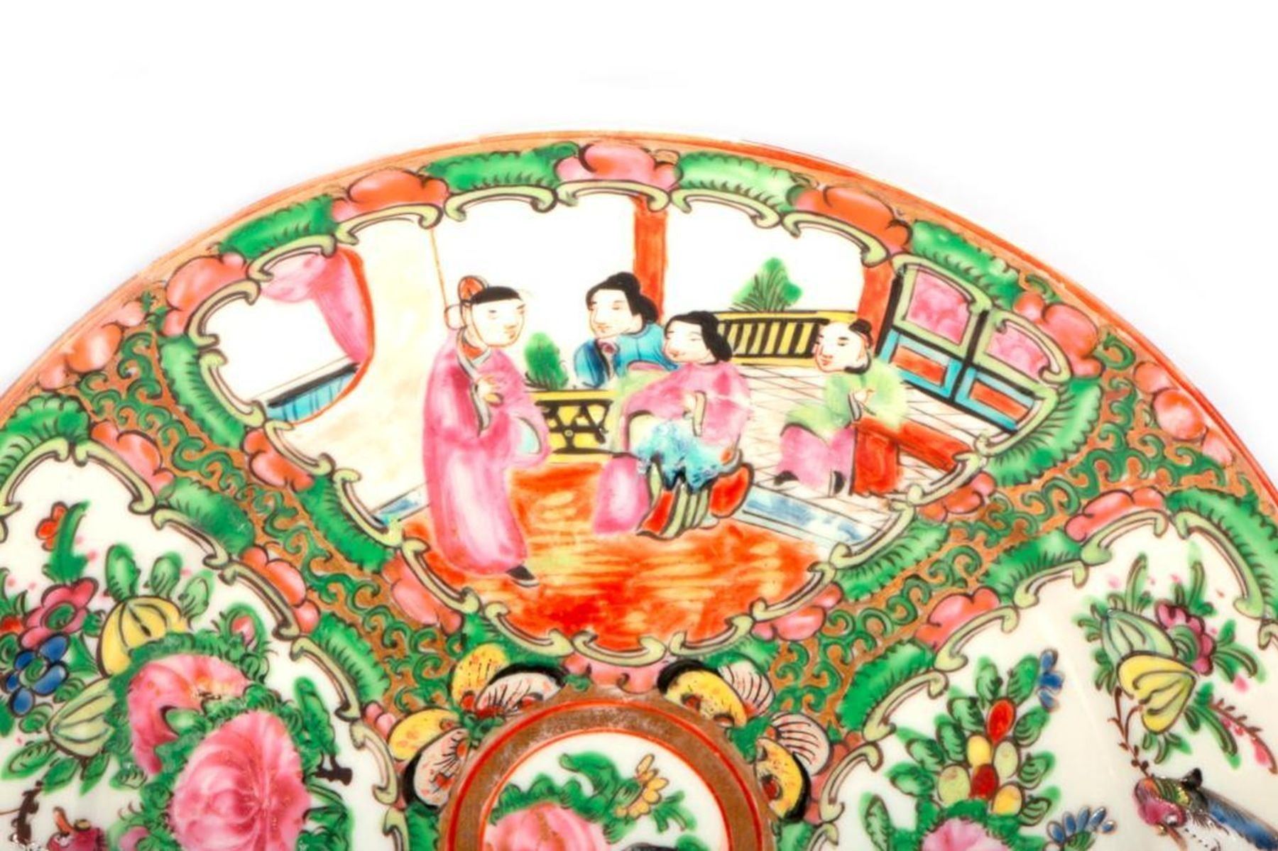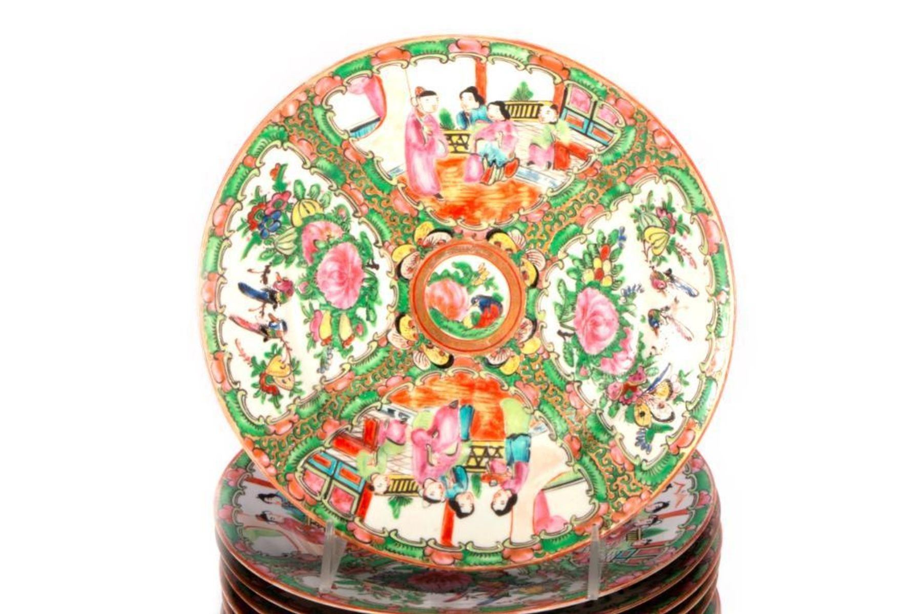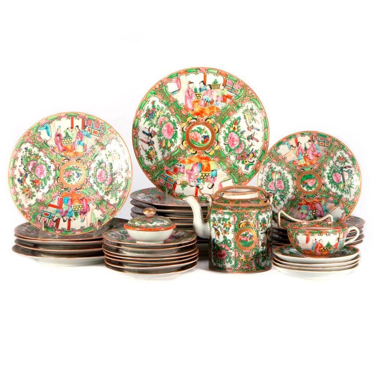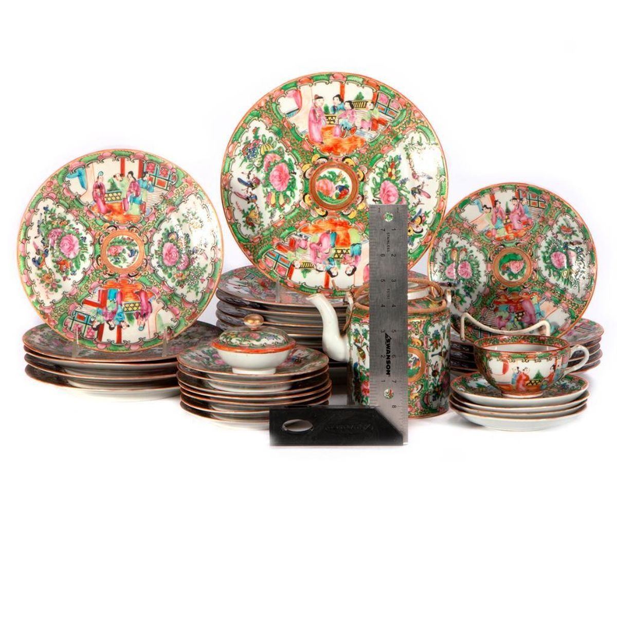 A collection of 33 pieces of mid 20th century Chinese Rose Canton porcelain including seven 9 3/4 inch plates, five 8 1/2 inch plates, six 7 1/4 inch plates, seven 6 1/4 inch plates, four 5 1/2 inch plates, a teapot, two teacup and a spare lid.