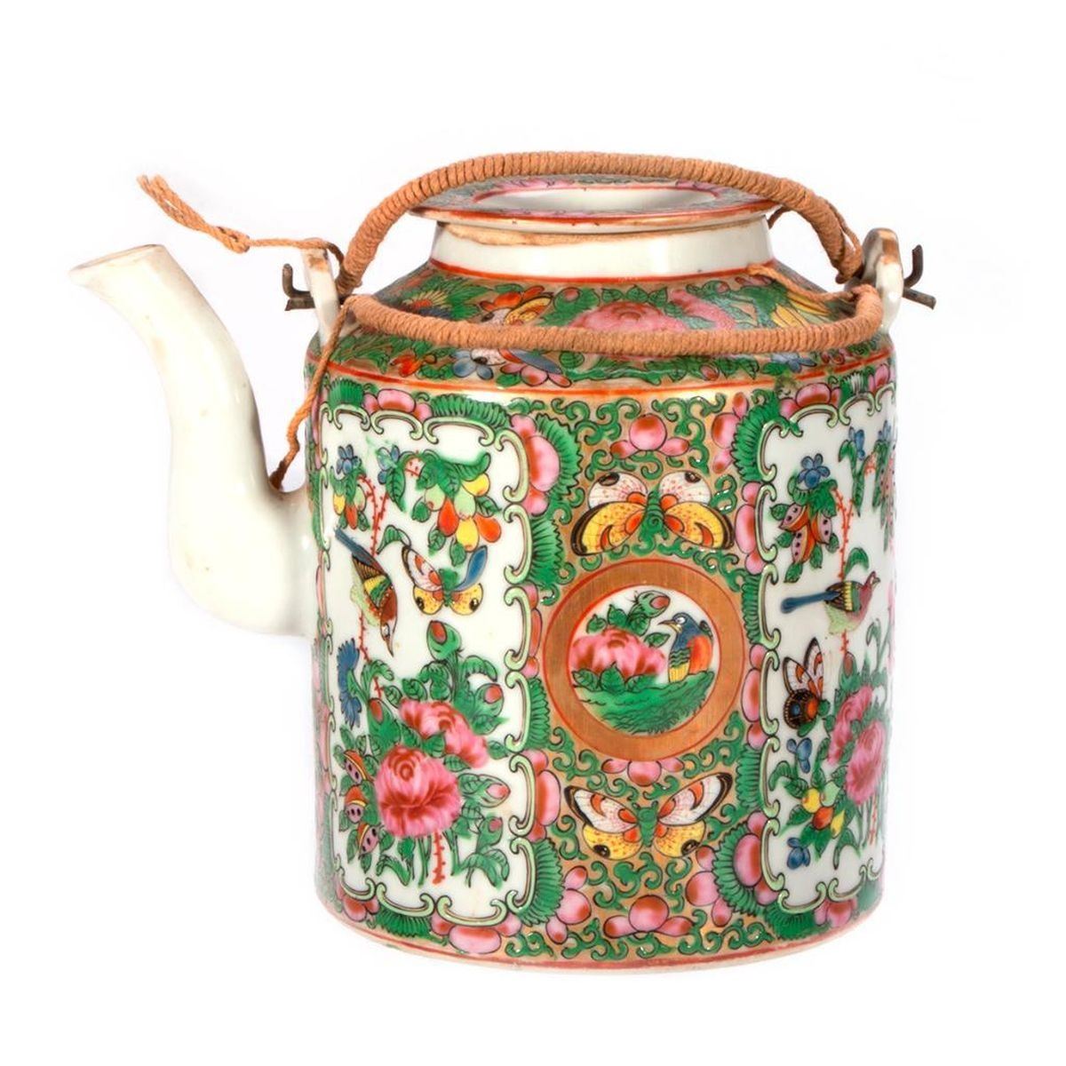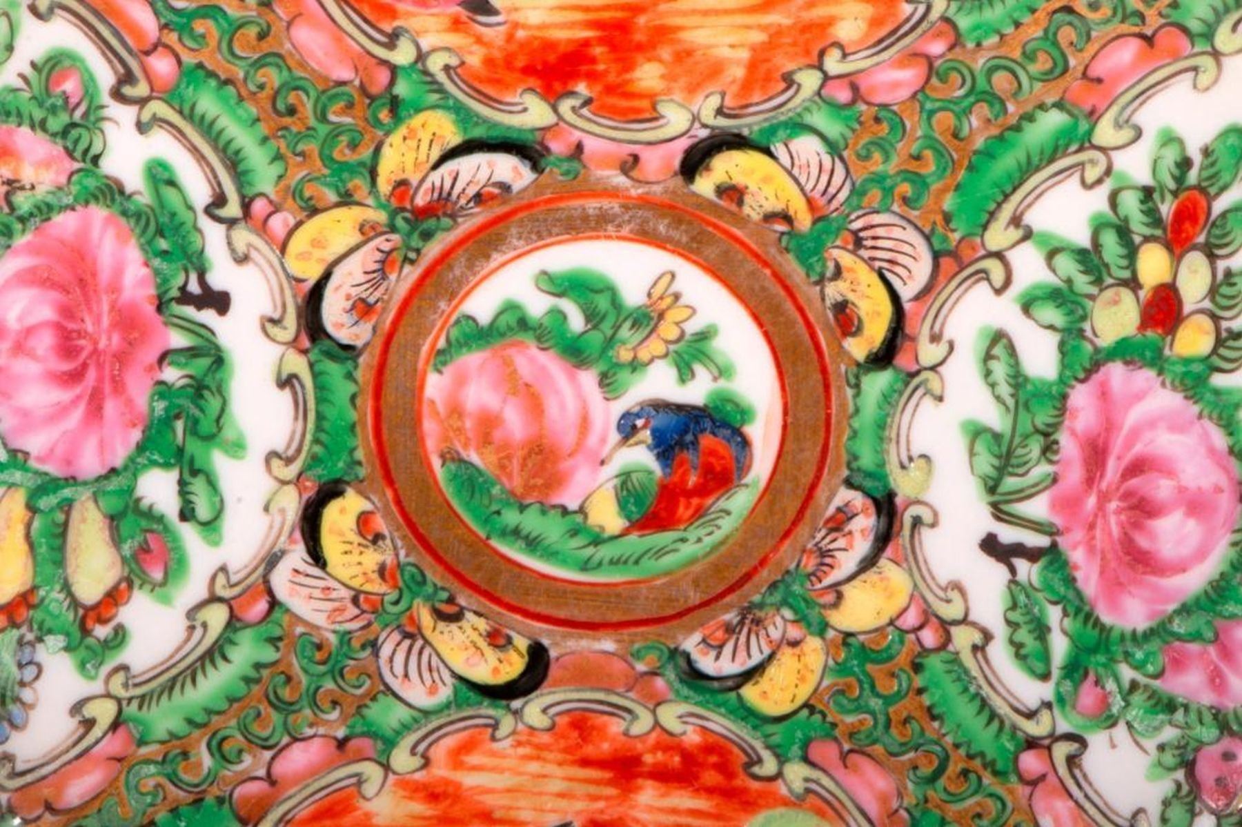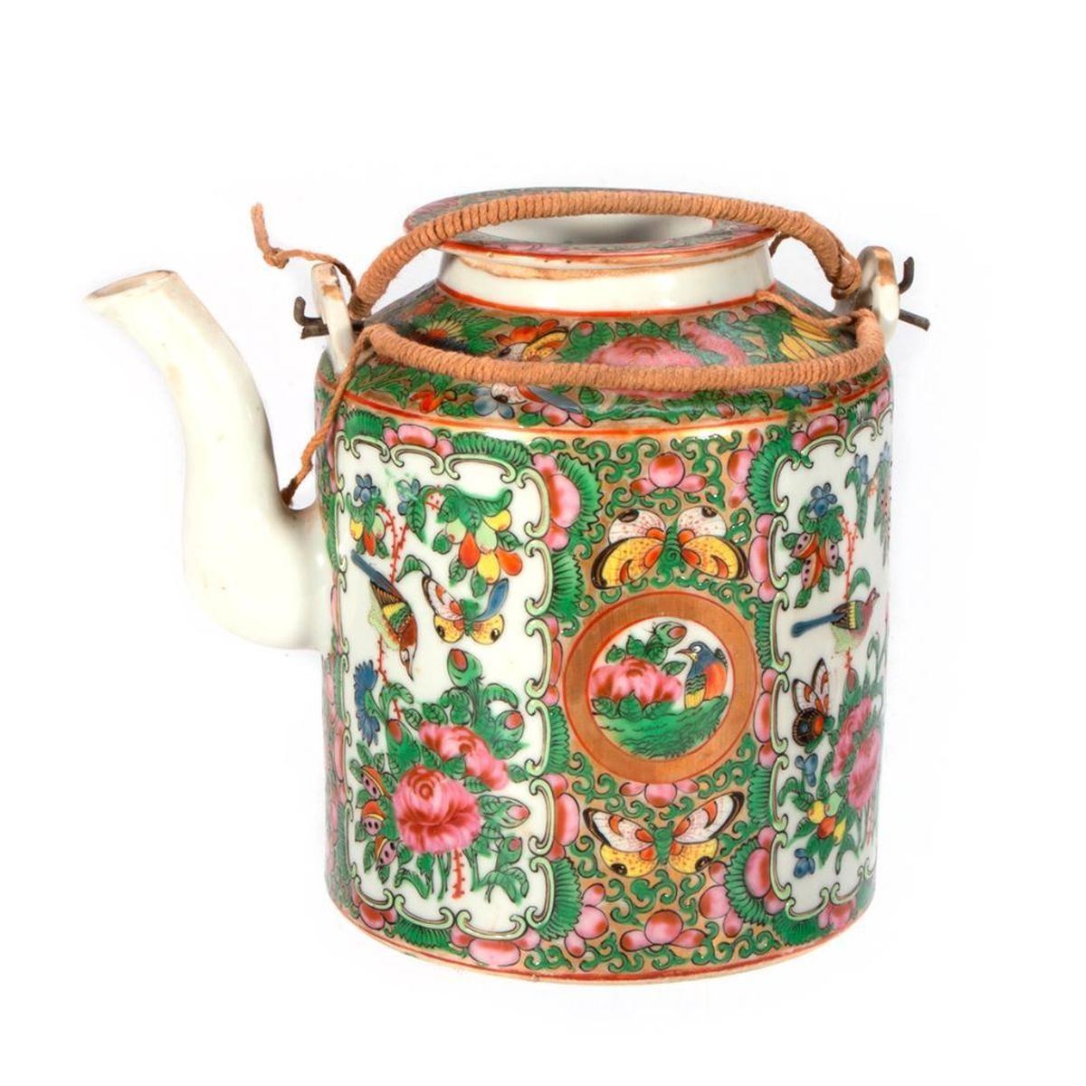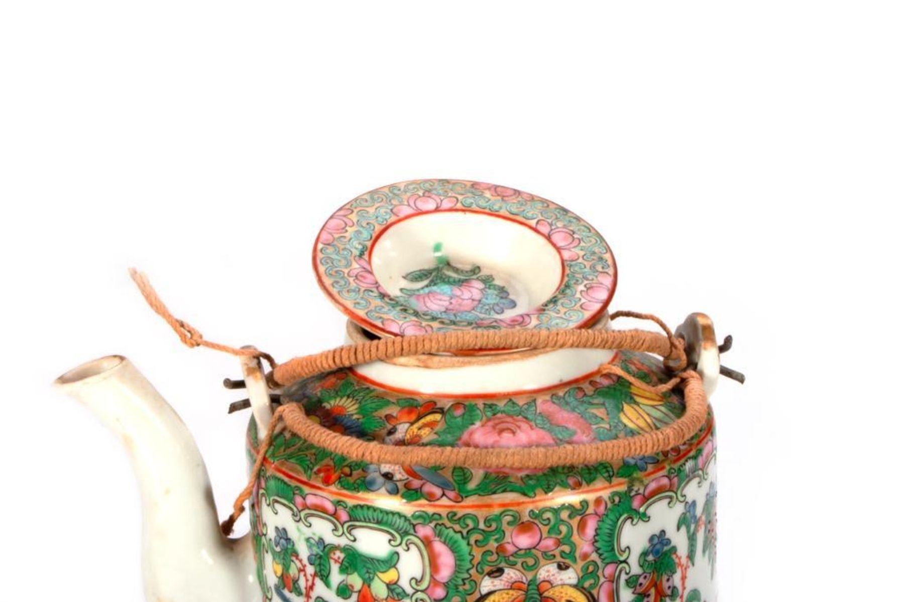 A collection of 33 pieces of mid 20th century Chinese Rose Canton porcelain including seven 9 3/4 inch plates, five 8 1/2 inch plates, six 7 1/4 inch plates, seven 6 1/4 inch plates, four 5 1/2 inch plates, a teapot, two teacup and a spare lid.