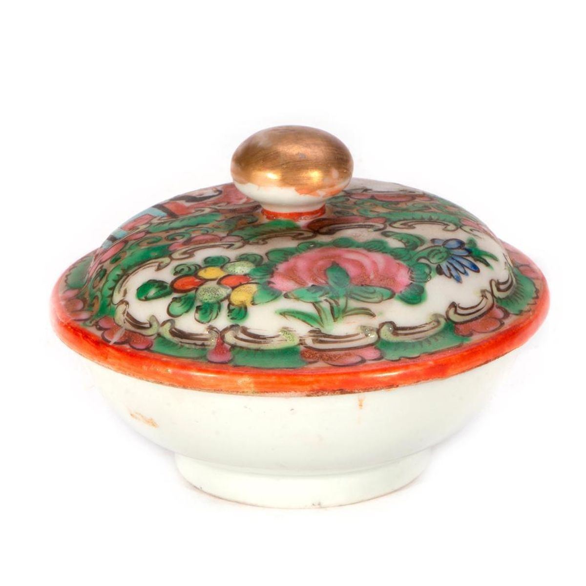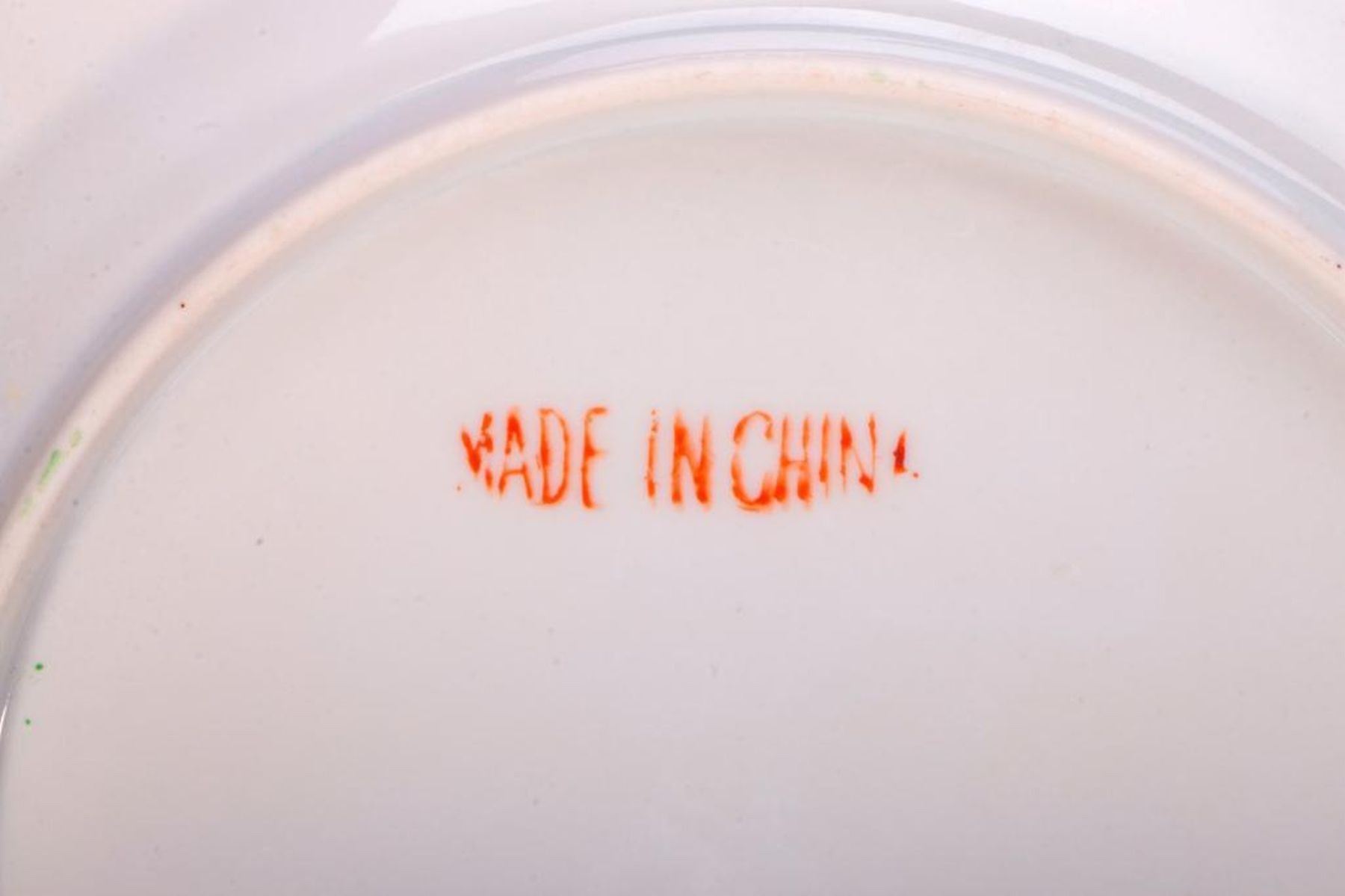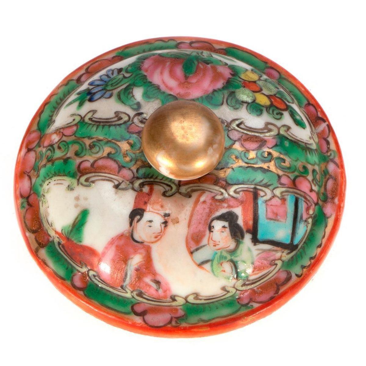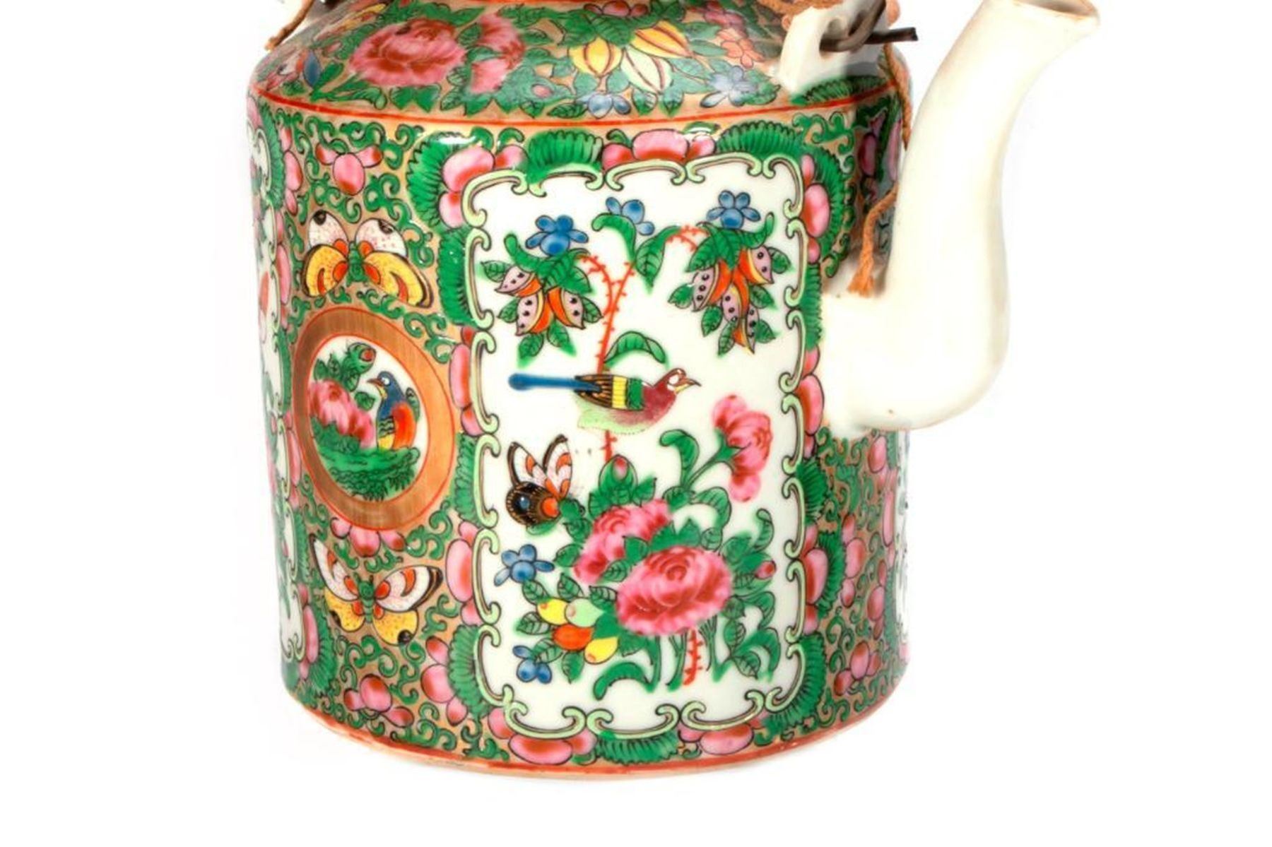 A collection of 33 pieces of mid 20th century Chinese Rose Canton porcelain including seven 9 3/4 inch plates, five 8 1/2 inch plates, six 7 1/4 inch plates, seven 6 1/4 inch plates, four 5 1/2 inch plates, a teapot, two teacup and a spare lid.