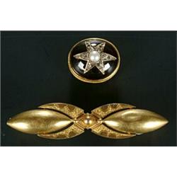 A collection of Victorian and later jewellery, comprising; a Victorian gold and garnet carbuncle oval brooch applied with a half-pearl and rose diamond star motif, a gold brooch with a central engraved scrolling cross and hollow oval panels, a pair of gold oval fluted pendent earrings, a Murrle, Bennett & Co. steel hat pin with a gold scrolling terminal (lacking a stone), stamped '9ct', a hat pin with a knot terminal, stamped '9ct', an early 20th century oval locket-back pendant with a seed pearl border and set with a miniature of young girl feeding chickens, a seed pearl triple bead knife edge bar brooch, four tortoiseshell buttons, a branch coral necklace, a 9ct gold rope chain, and other items
