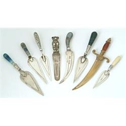 A collection of book marks, comprising; a silver teddy bear, Birmingham 1909, a dirk with Scottish pebble handle, Chester 1910 by Adie and Lovekin Ltd, a trowel with a bloodstone handle and a trowel with floral embossed handle both by Crisford & Norris and stamped 'Sterling', a trowel with a monogram and an ivory handle by Adie & Lovekin Ltd, stamped 'Sterling', a trowel with blue stained agate handle, another with Scottish pebble handle, and a brass scimitar with agate handle