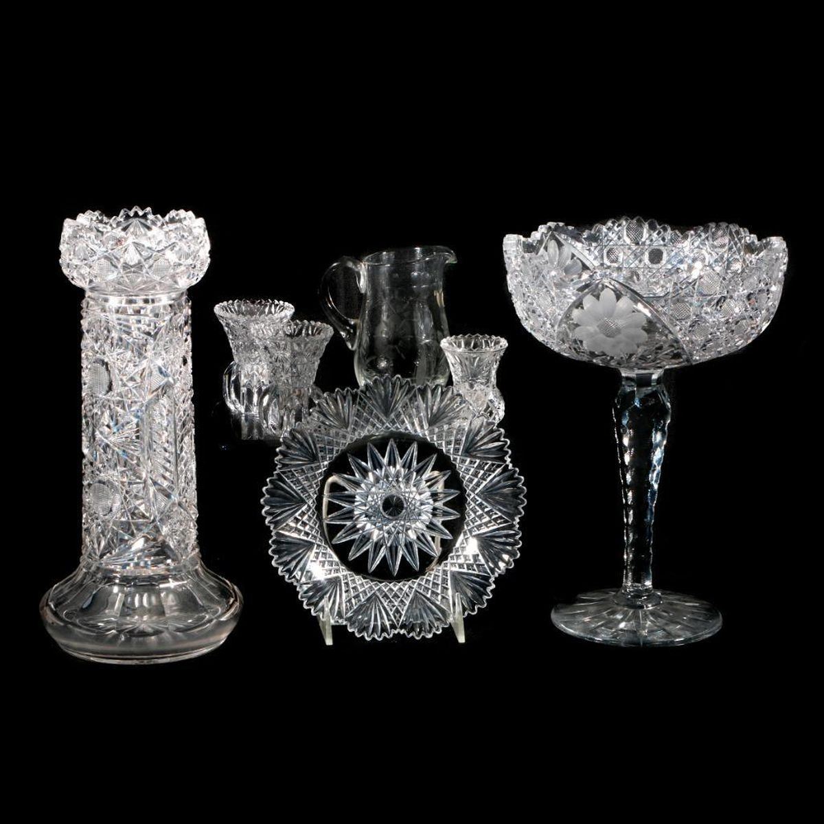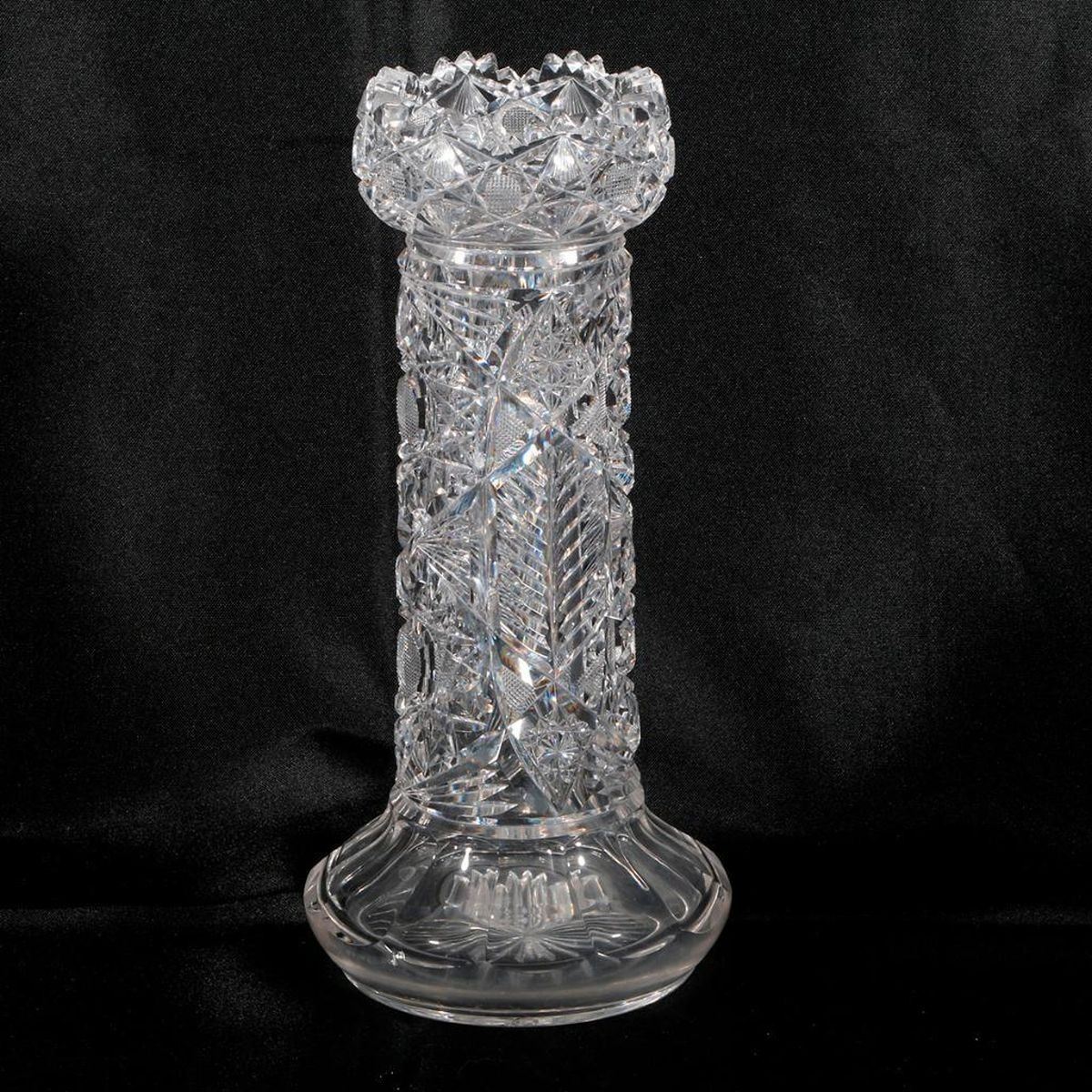 A collection of thirteen late 19th and 20th century crystal vases and serving pieces, the largest a vase measuring 12 inches high.