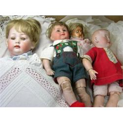 A collection of four various dolls, to include: a Heubach bisque headed boy doll with painted eyes..