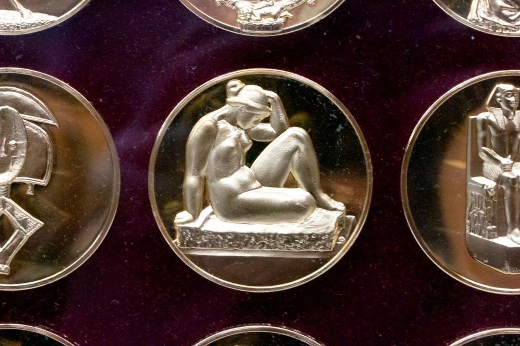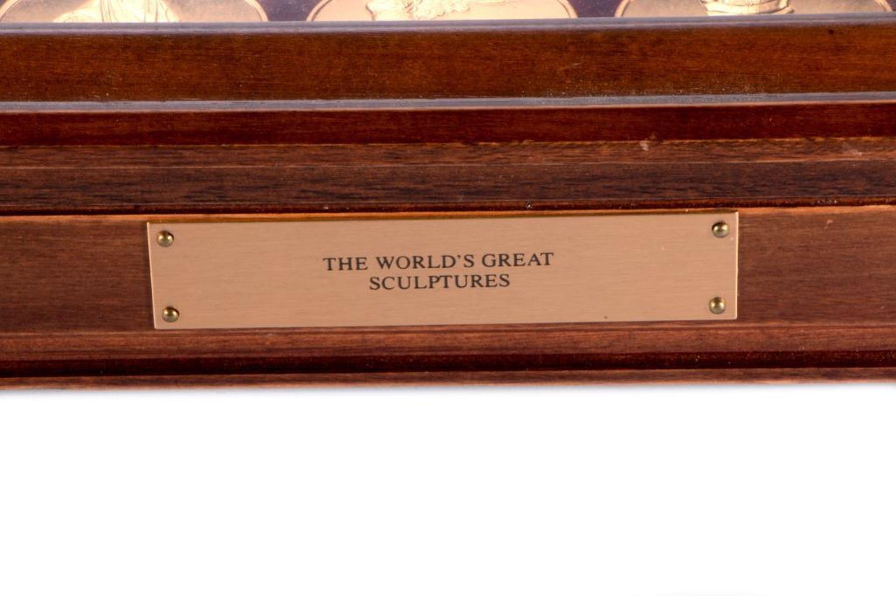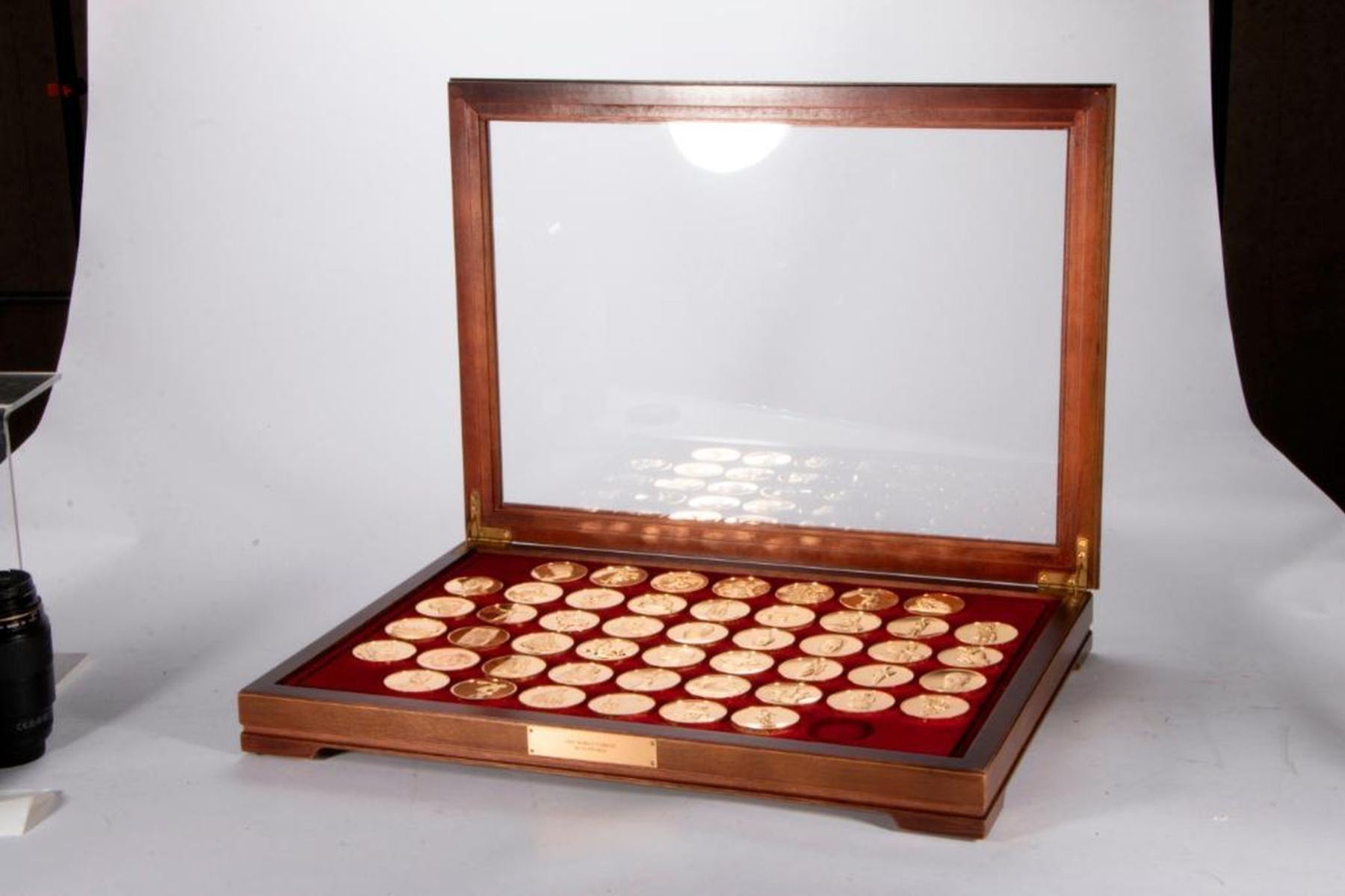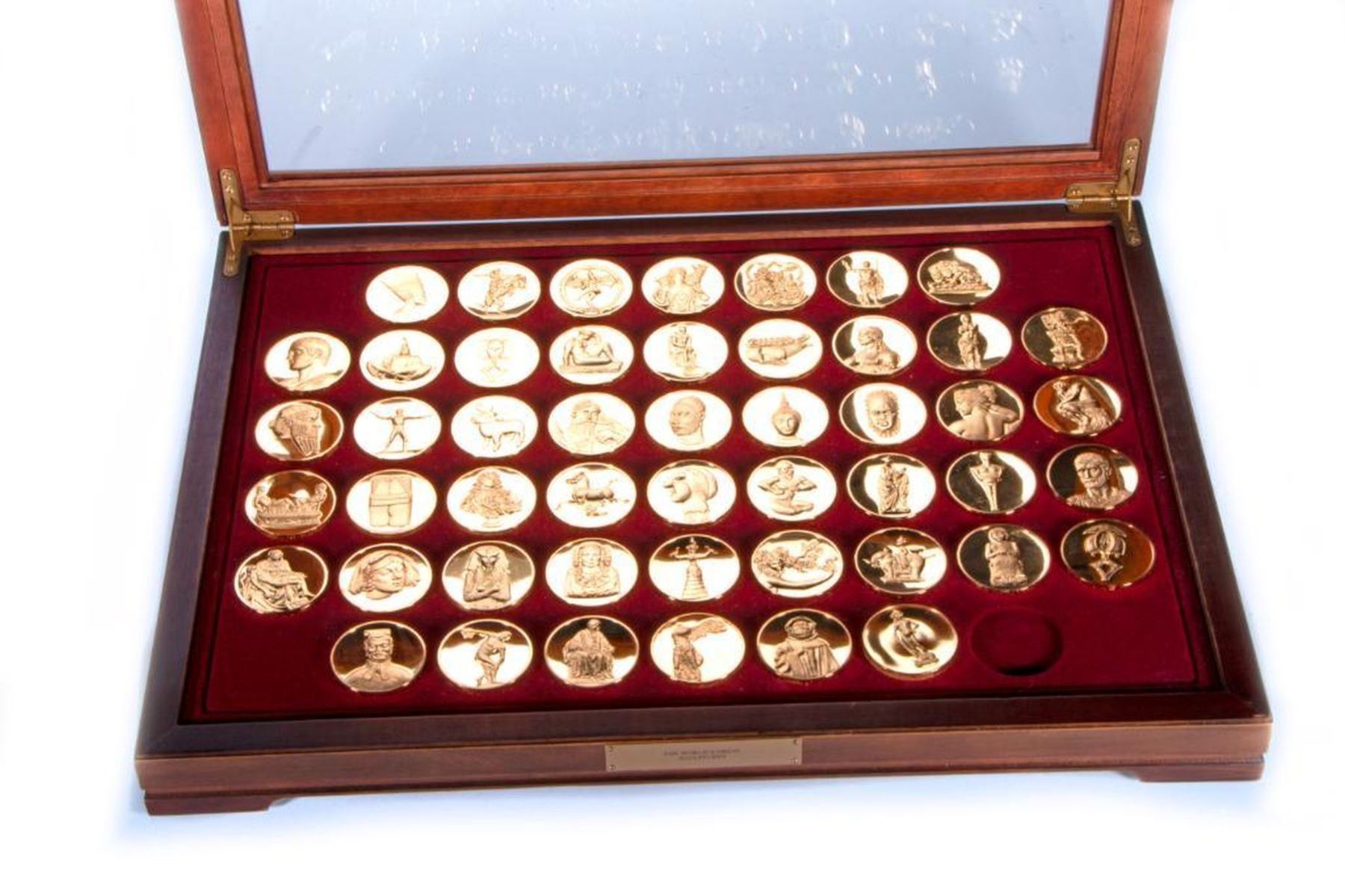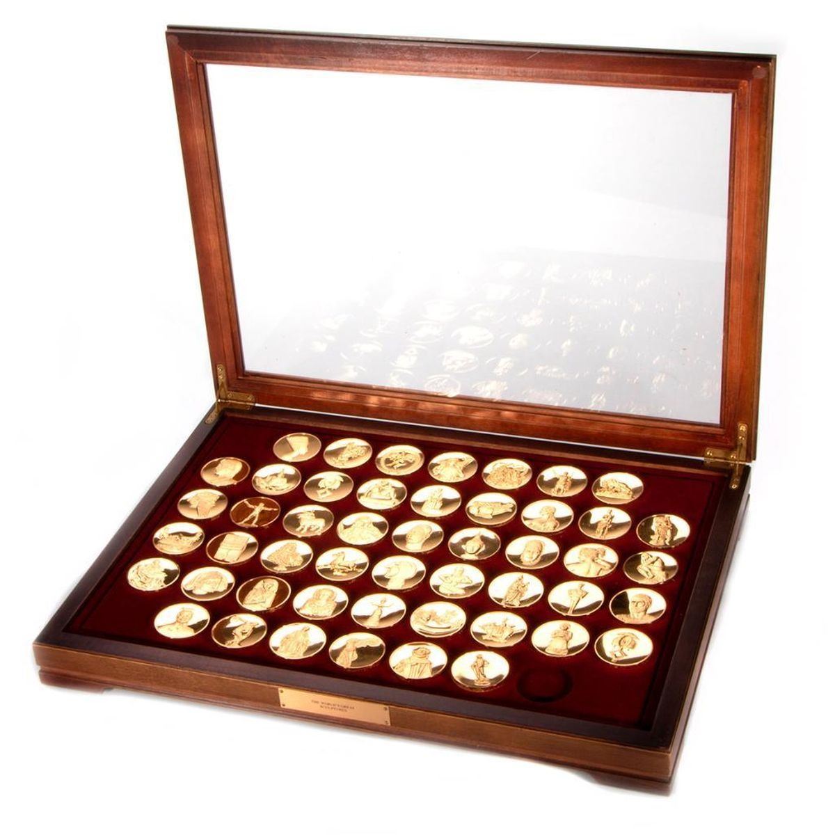 A collection of gold plate mythological figures from world history in a case measuring 17 inches high x 23 1/2 wide. (one missing).