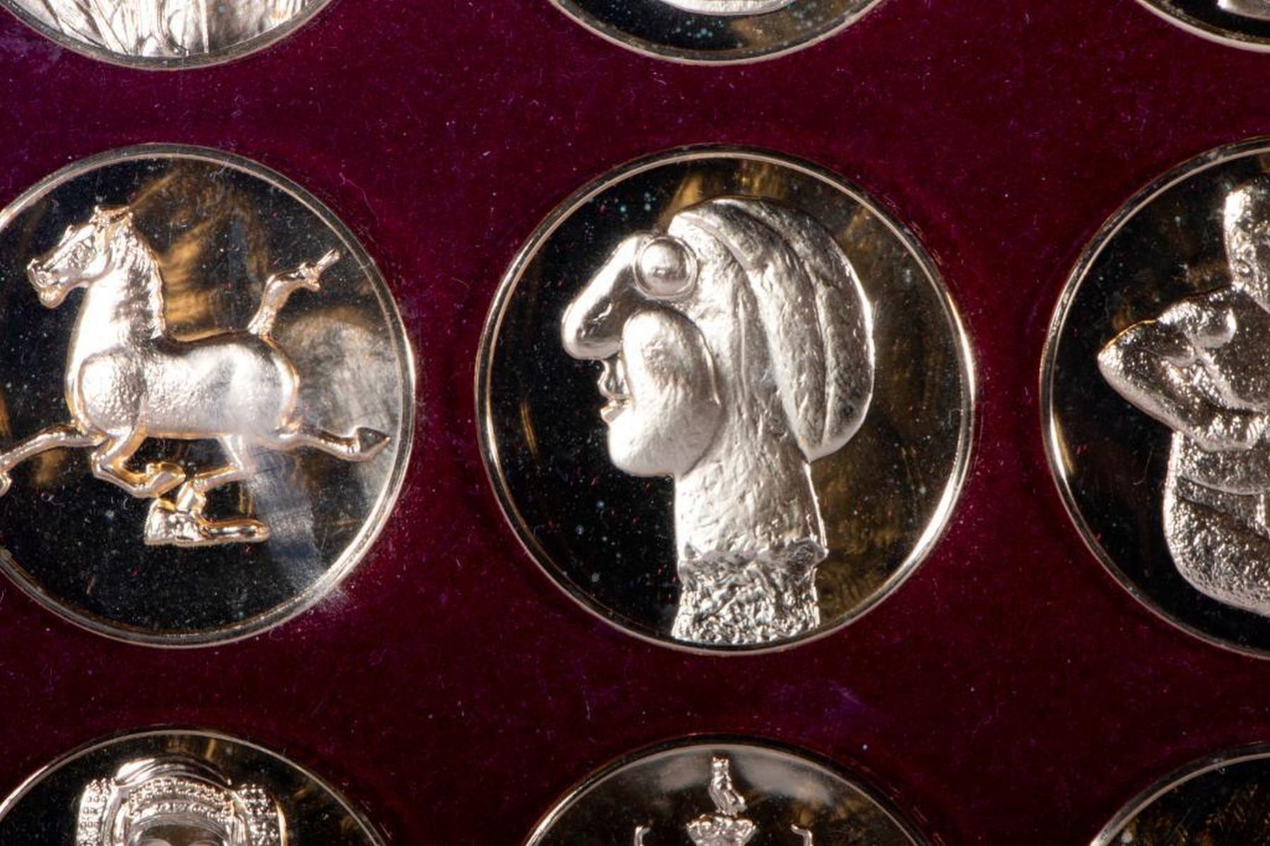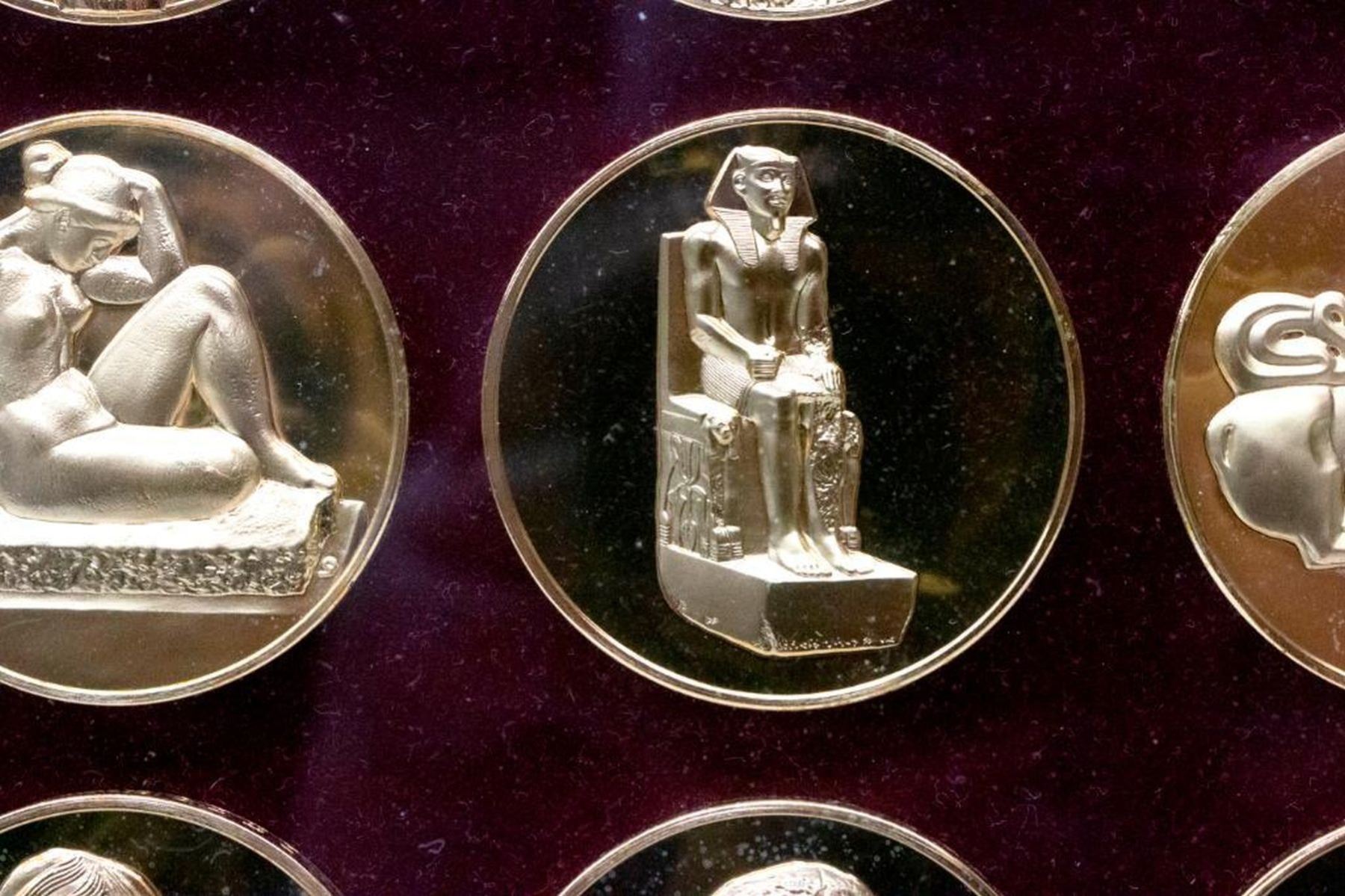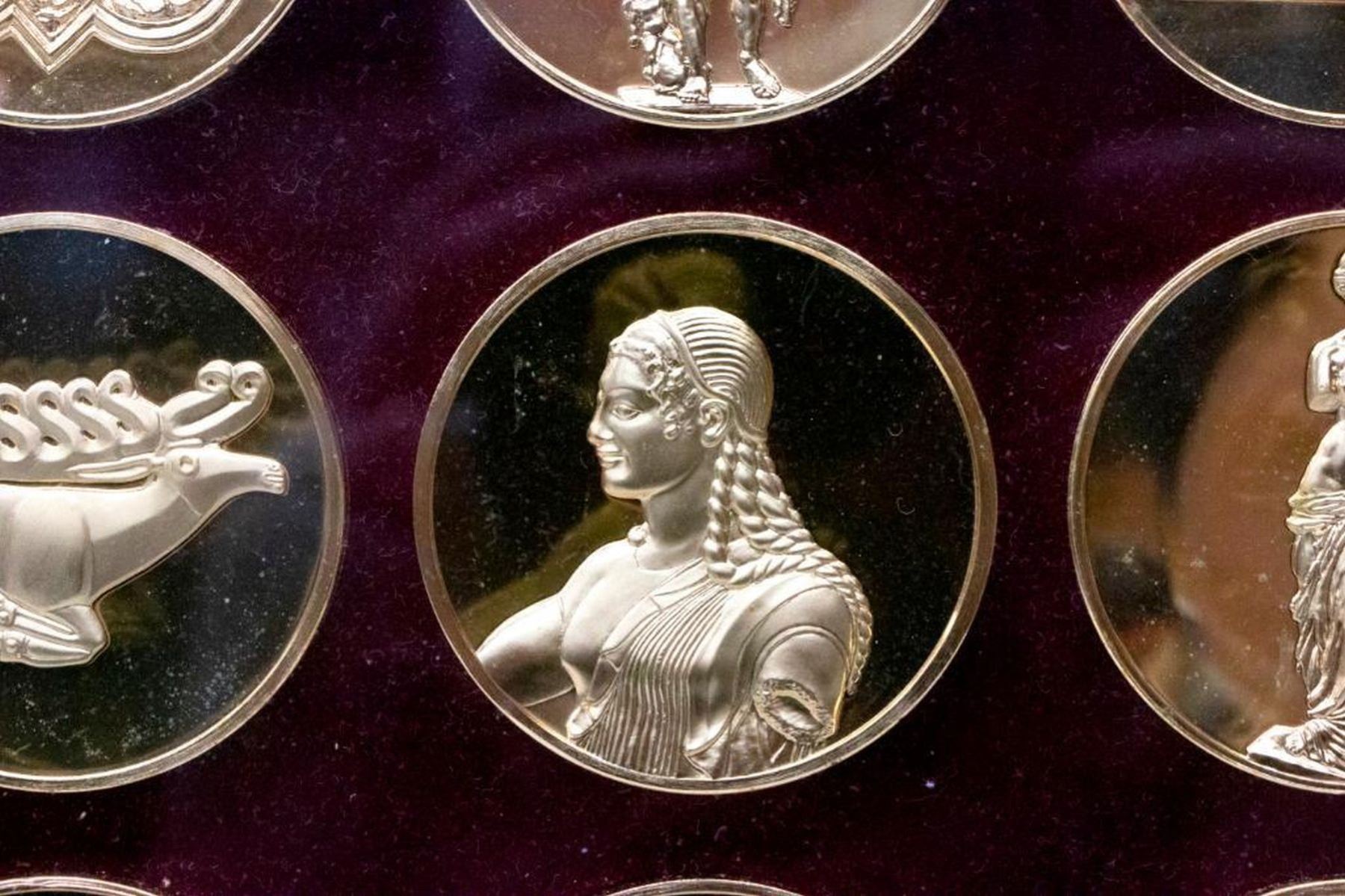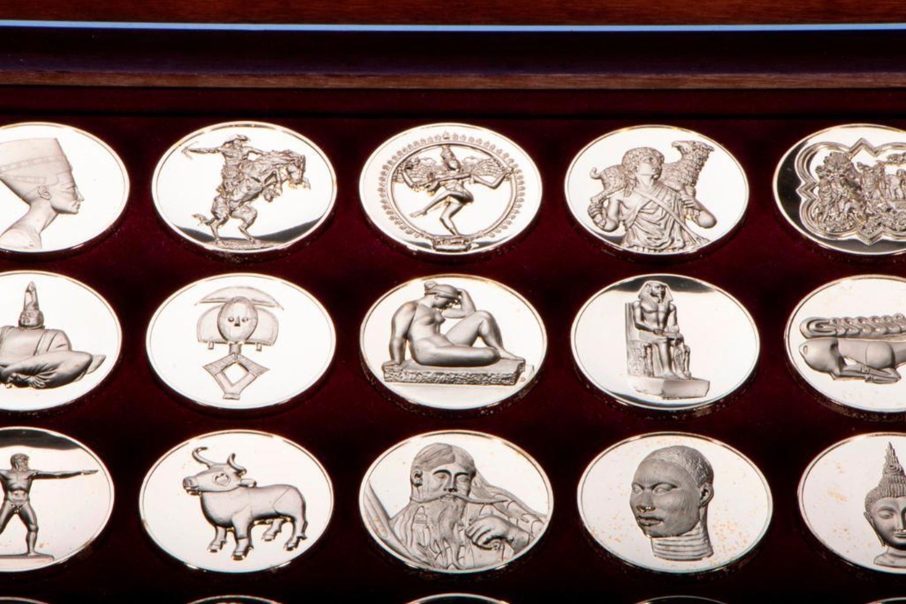 A collection of gold plate mythological figures from world history in a case measuring 17 inches high x 23 1/2 wide. (one missing).