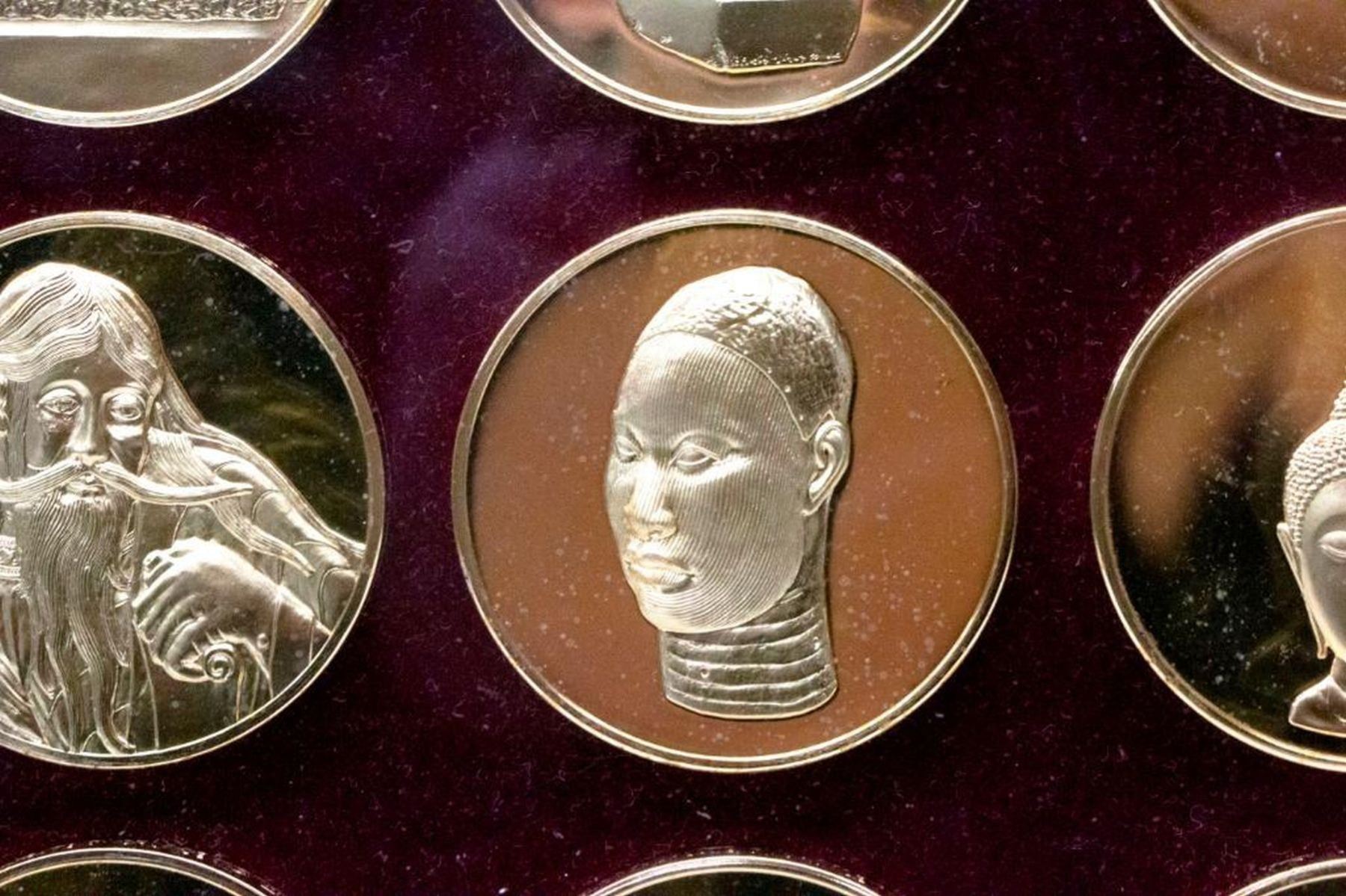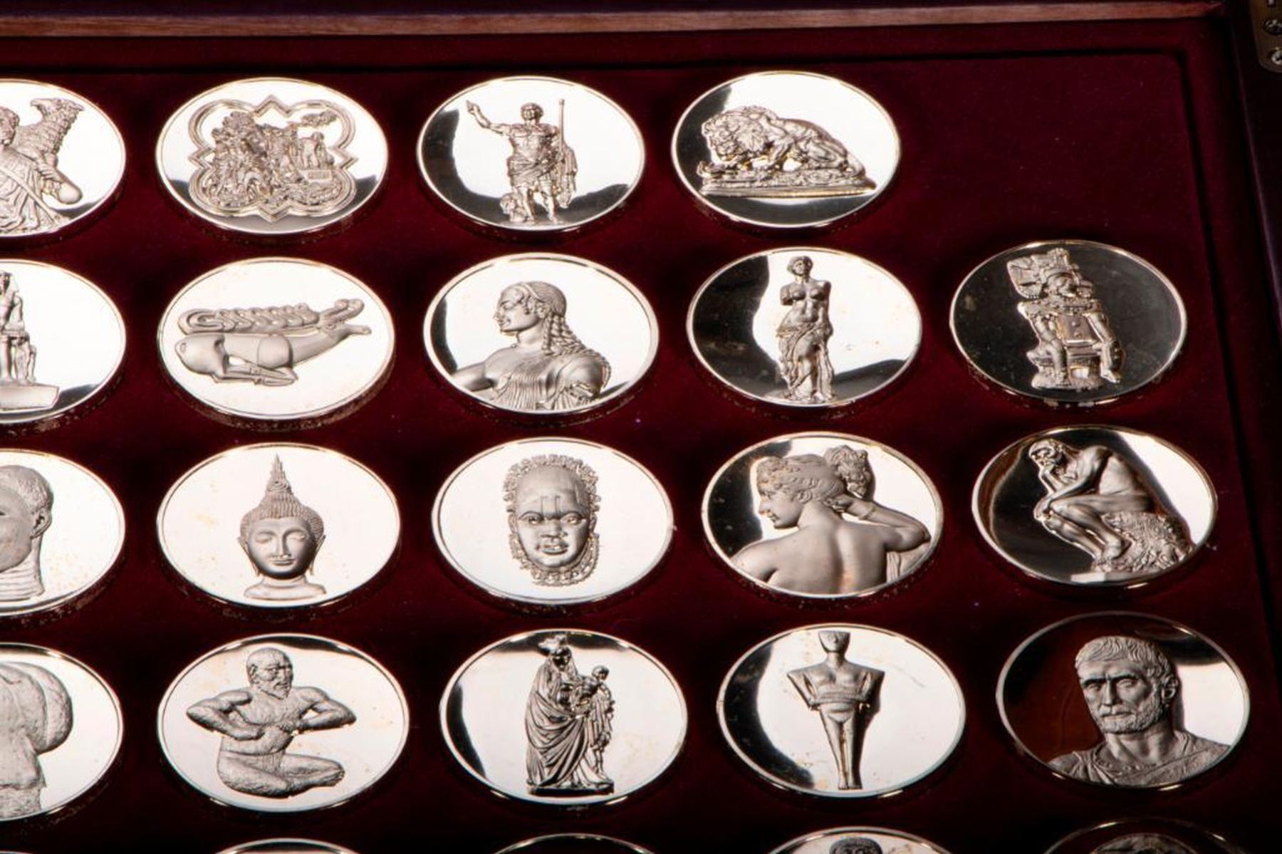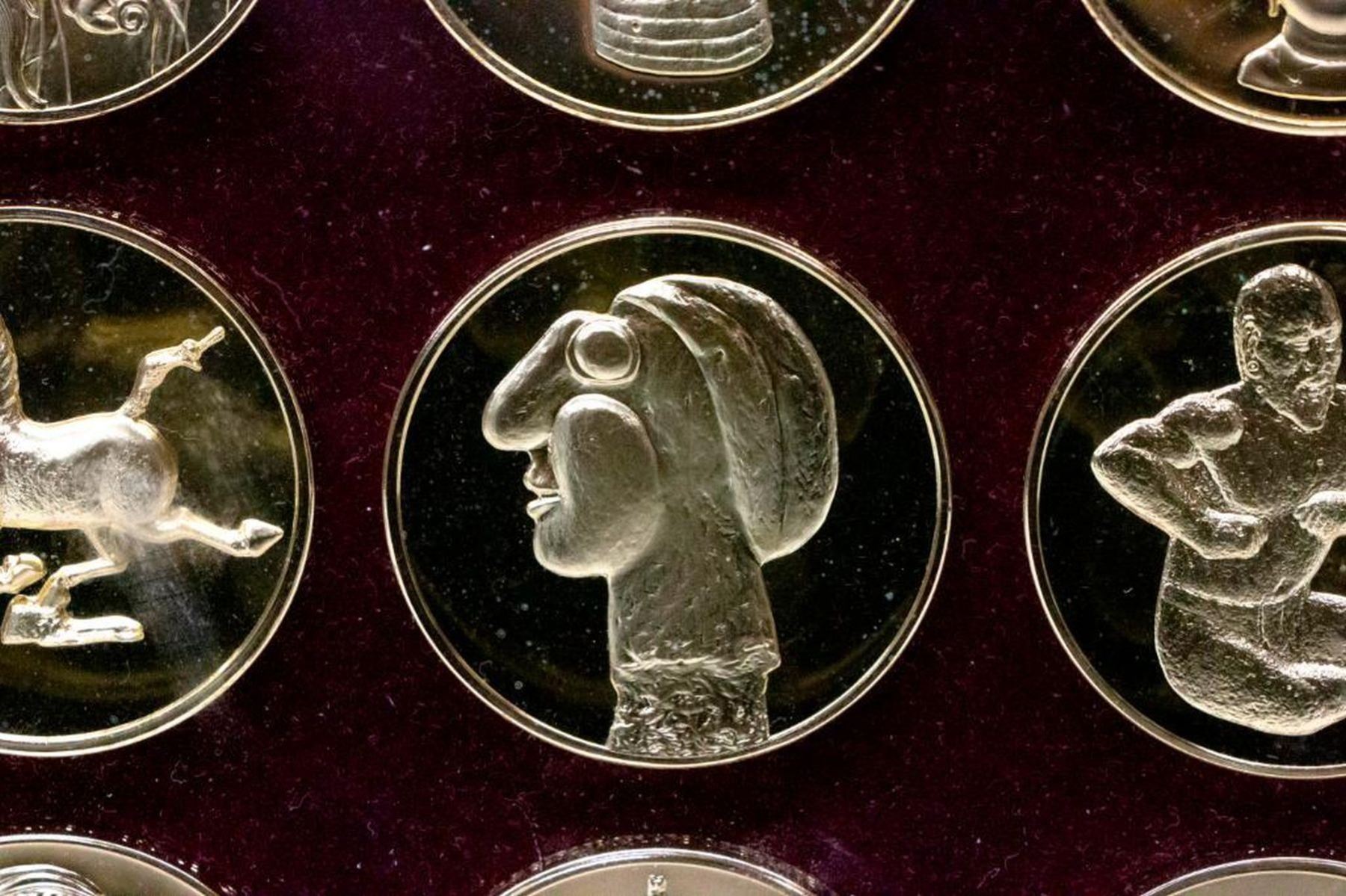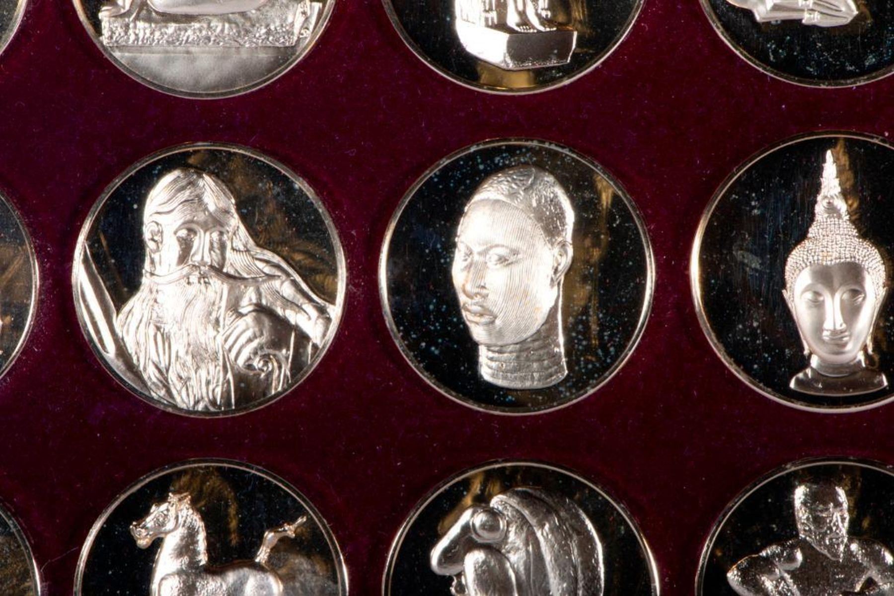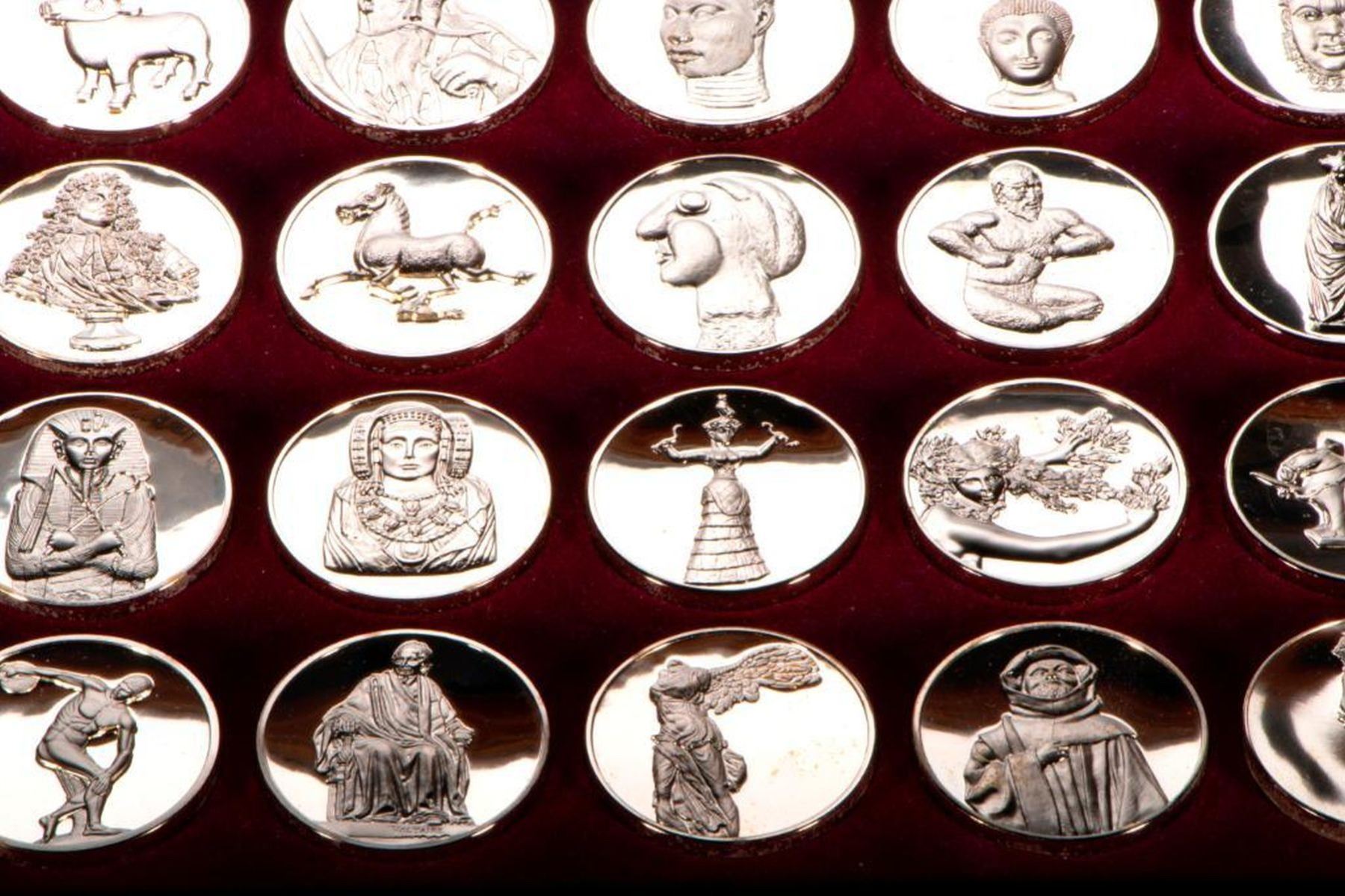 A collection of gold plate mythological figures from world history in a case measuring 17 inches high x 23 1/2 wide. (one missing).