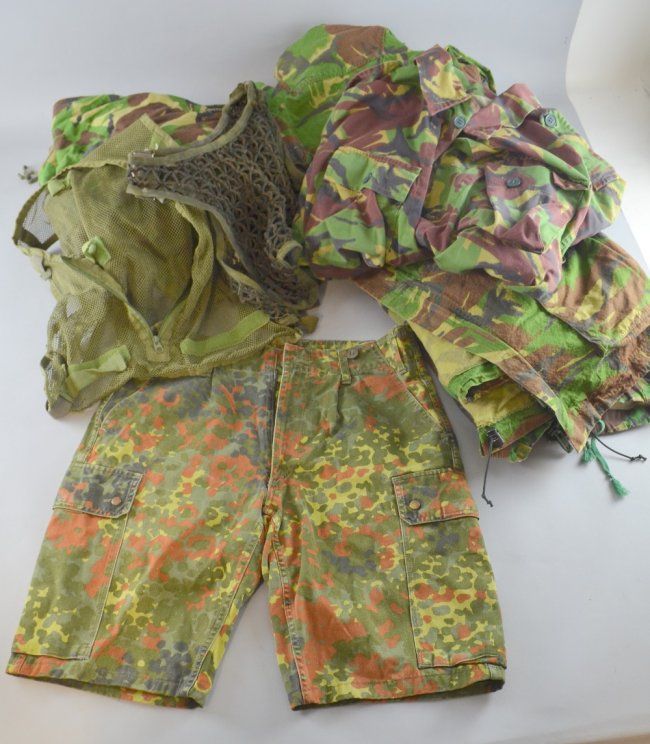 A collection of post WWII camouflage uniform including a pair of shorts four jackets, five trousers and two vests