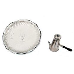 A collection of small silver, comprising; a pepper pot in the form of a straight tapering, side handled coffee pot, Chester 1900 by Saunders and Shepherd, 7cm high (2.75 in), a George III Irish crested round sweet dish with a crimped rim, circa 1785 by Mathew West, 10cm diameter (4 in), a George III etui (damaged) and a round pill box, unmarked, 2.5cm (1 in), an engraved oblong needle case, Birmingham 1851 by Thomas Dones, 7cm (2.75 in), an engine turned and foliate engraved vesta/match case, Birmingham 1898, an wishbone sugar tongs, London 1903 by C G Asprey, a round dressing table box, Chester 1900 by Nathan & Hayes, 4.5cm (1.5 in), an engine turned and leaf chased hexagonal propelling pencil, and a Charles and Diana commemorative thimble, Birmingham 1981