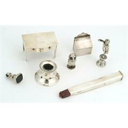 A collection of small silver, comprising; a stamp box in the form of a serpentine side table, with a hinged lid, one dummy drawer on square legs, Birmingham 1909 by A & J Zimmerman, 6 cm wide (2.25 in), a small capstan shaped inkwell, 1907, 4.5cm (1.75 in), an owl shaped small seal, Chester 1905, 3.5cm high (1.25 in), and wax stick holder, Chester 1908, both by S Mordan & Co Ltd, 10cm long (4 in), a desk seal in the form of a boy standing on a fluted round base, (unmarked), 6.25cm (2.5 in), a white metal stationary box, and an oblong floral chased fob seal