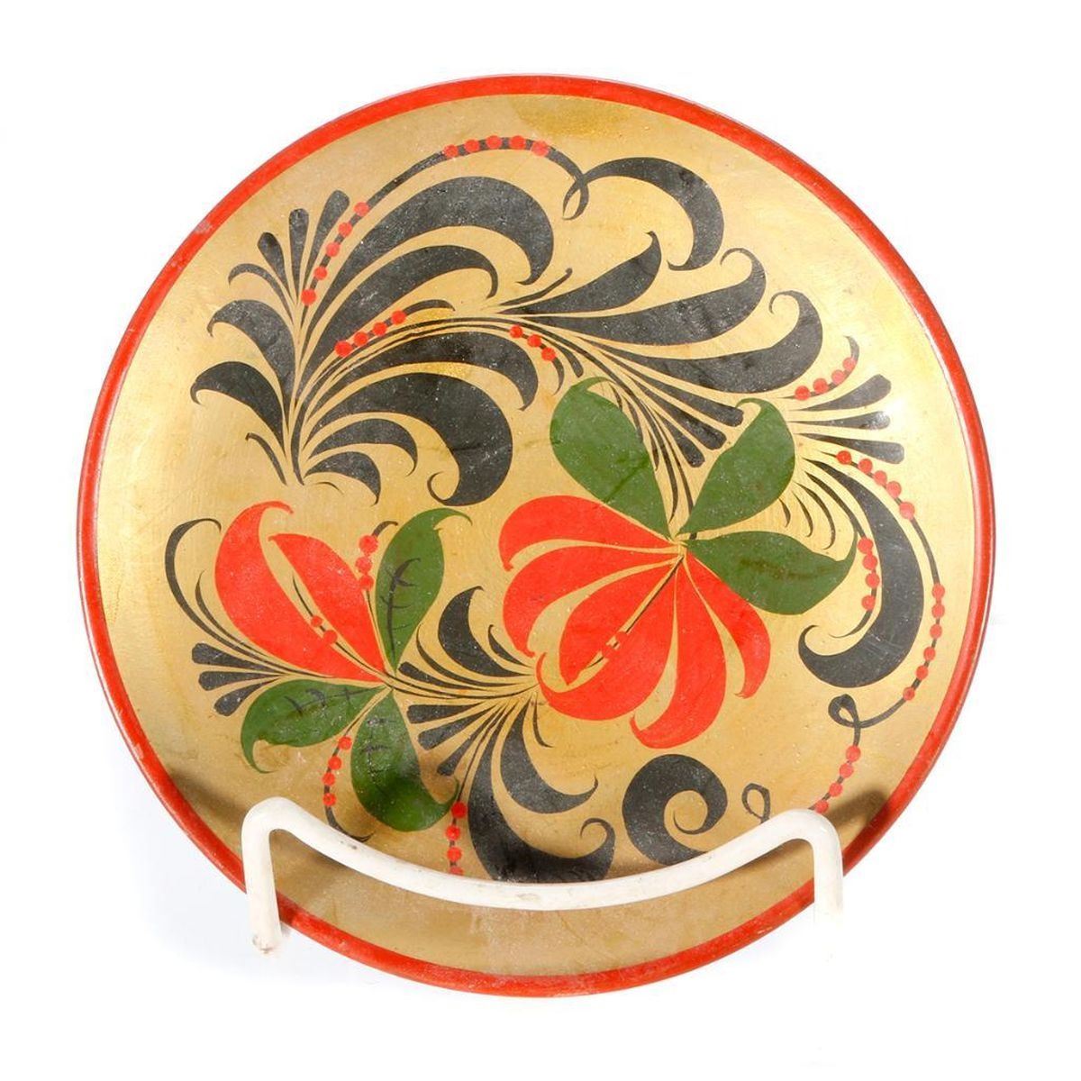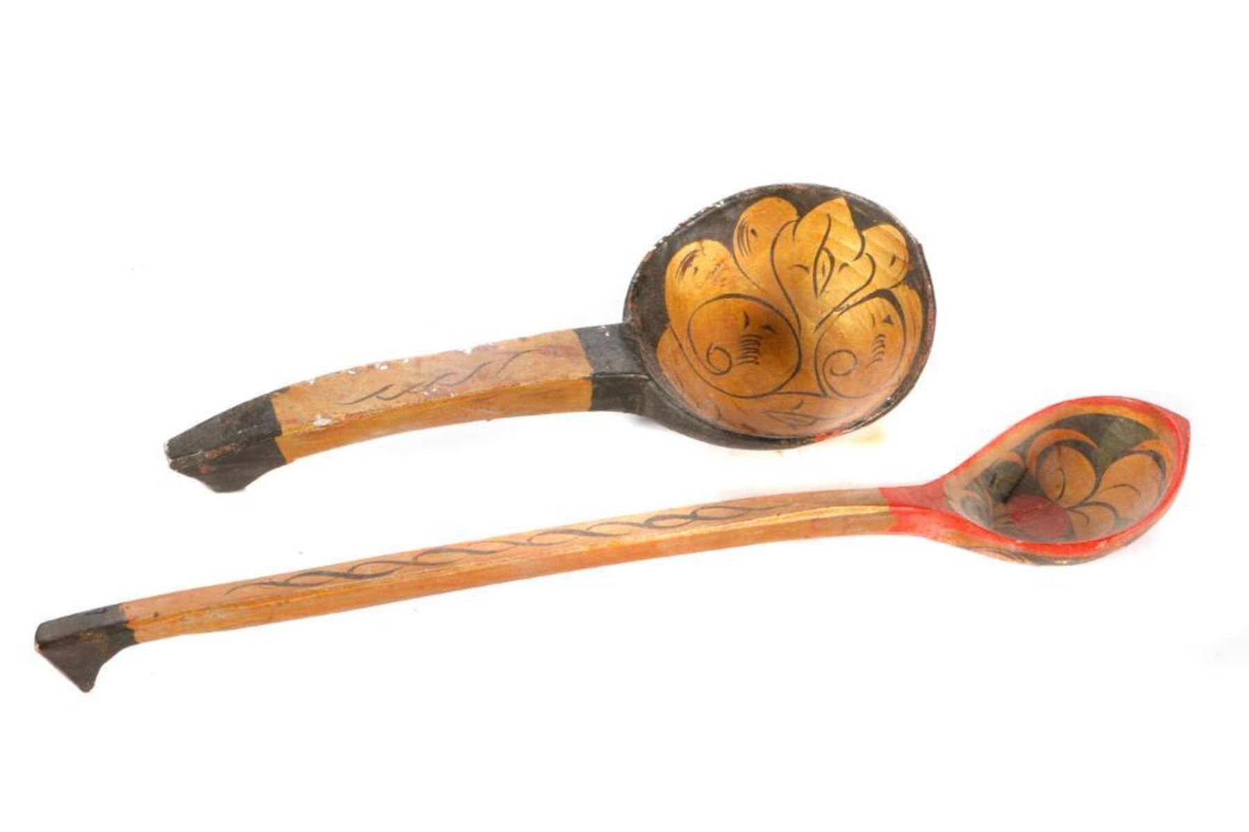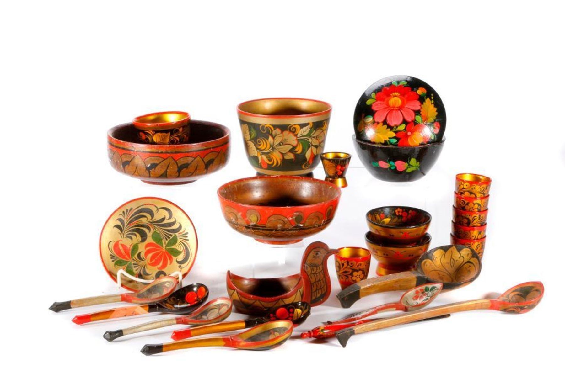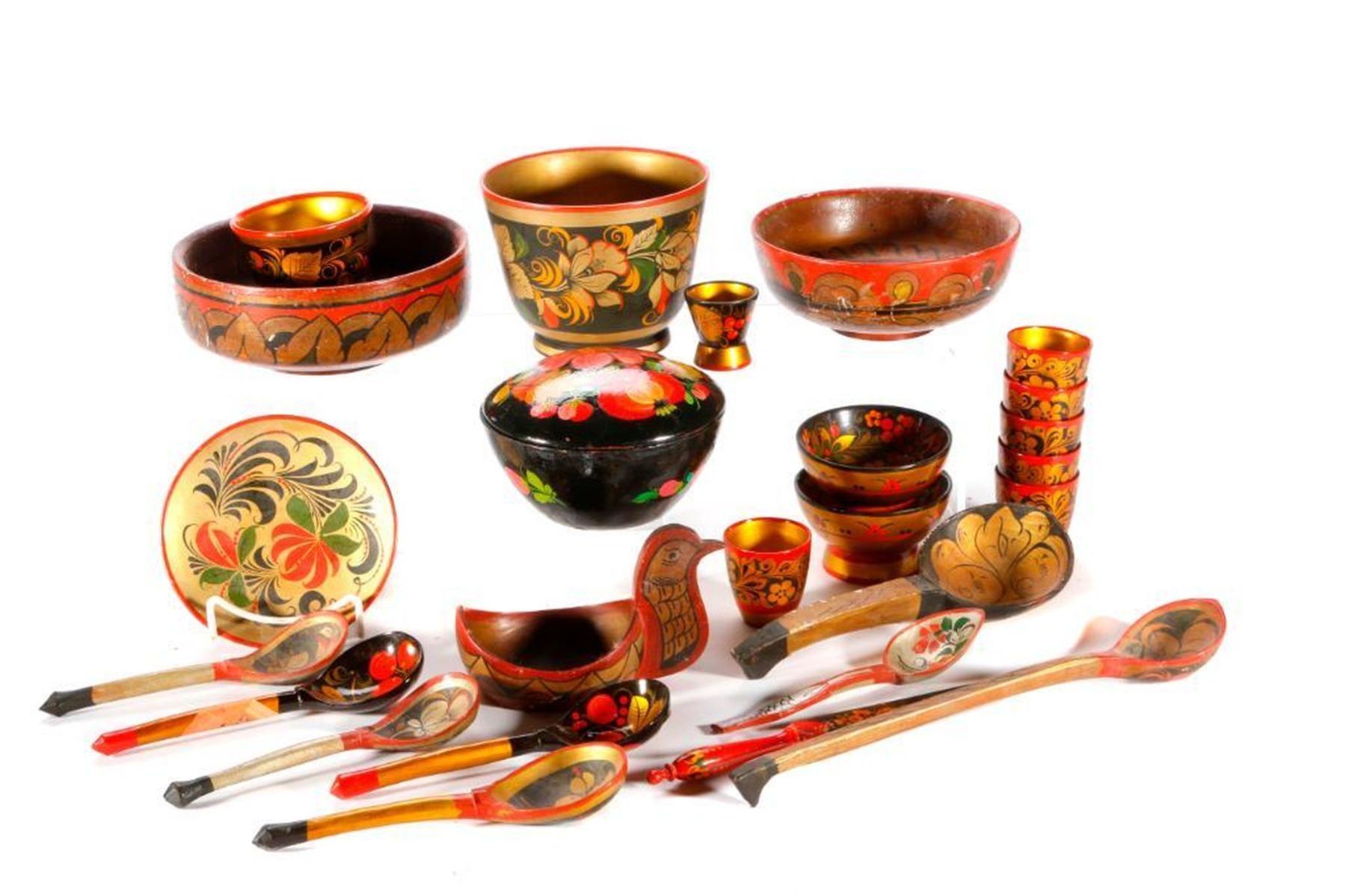 A collection of painted wooden Russian serving pieces including bowls, spoons, dishes and teacups. Twenty-seven pieces with the largest bowl measuring 8 inches in diameter.