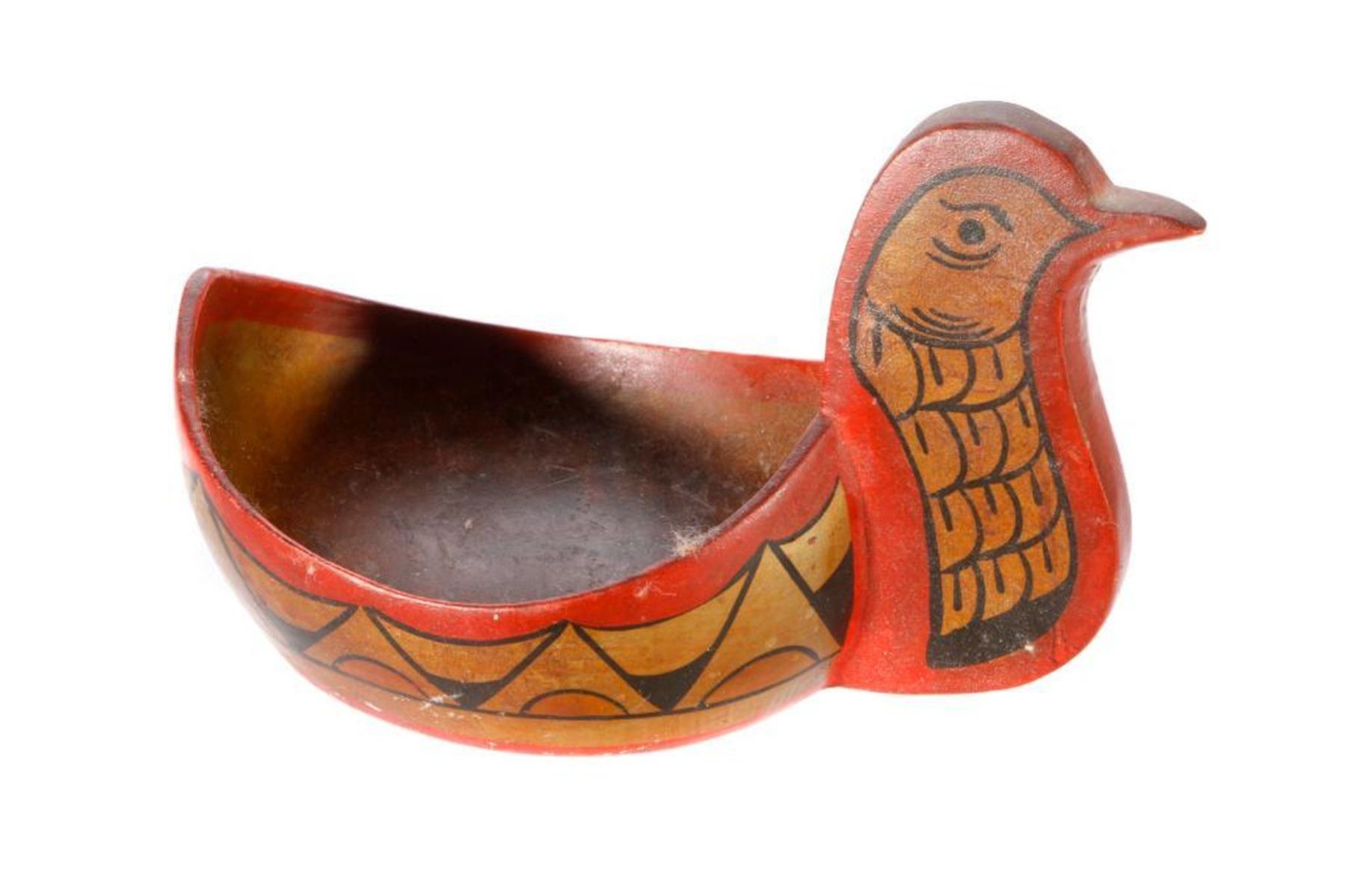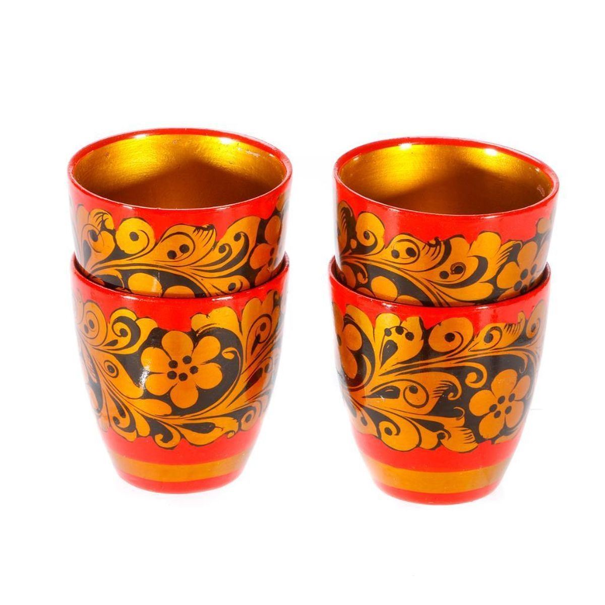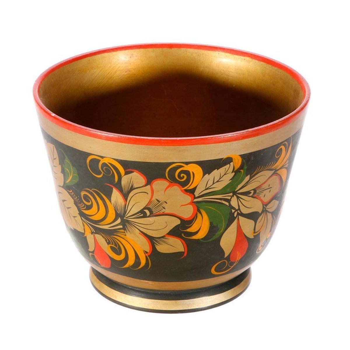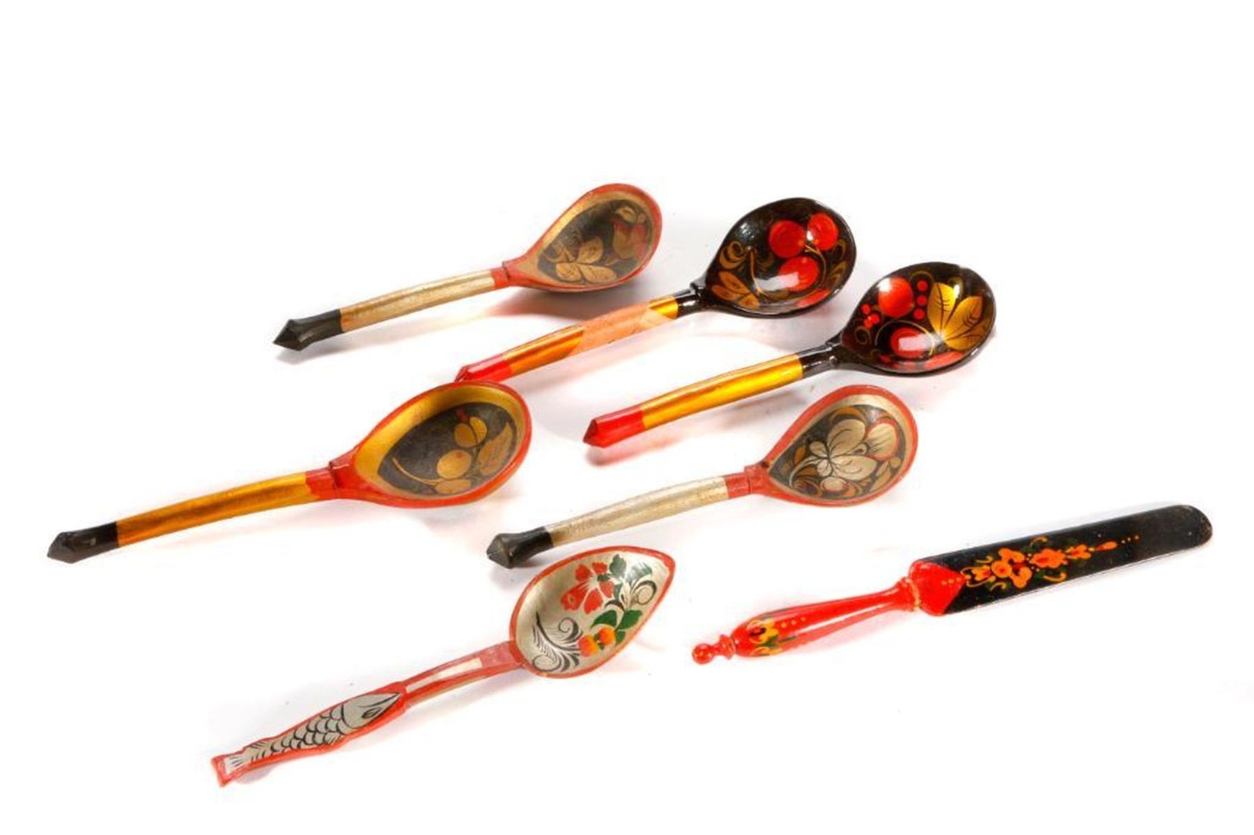 A collection of painted wooden Russian serving pieces including bowls, spoons, dishes and teacups. Twenty-seven pieces with the largest bowl measuring 8 inches in diameter.