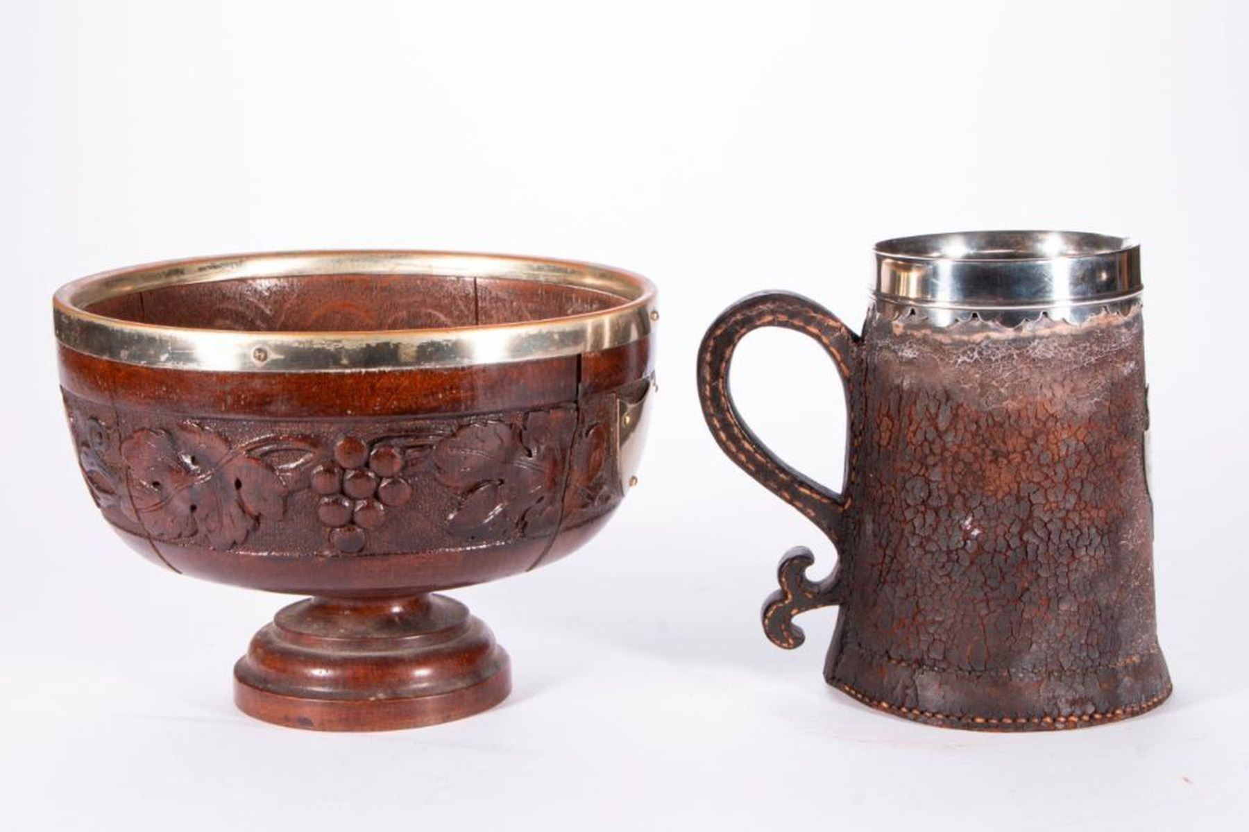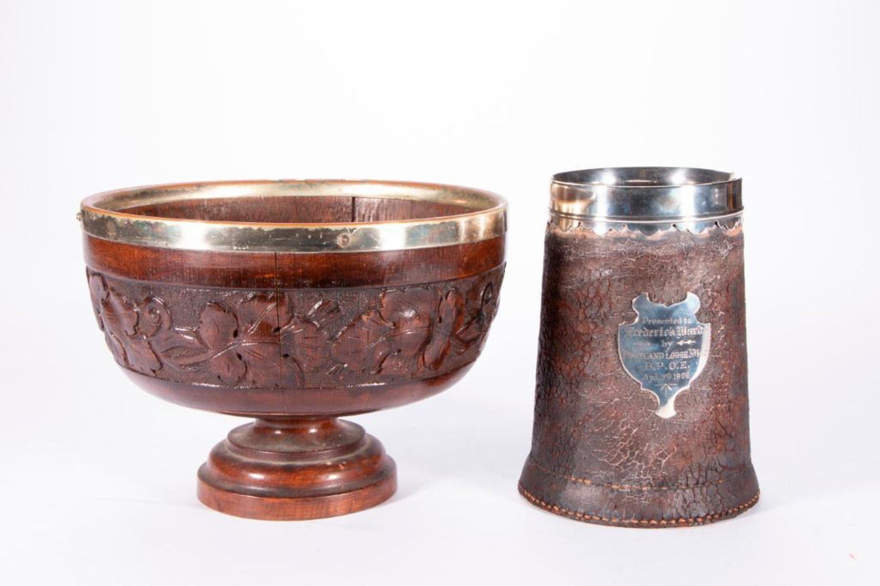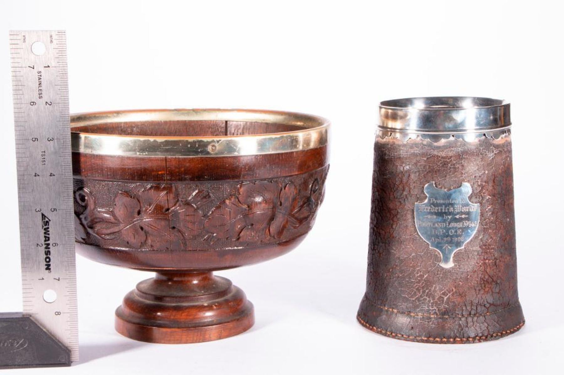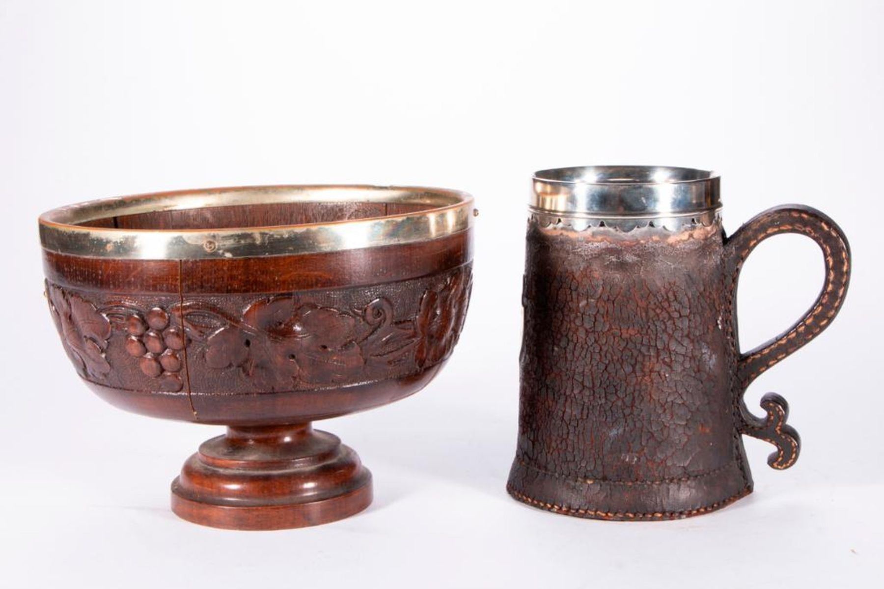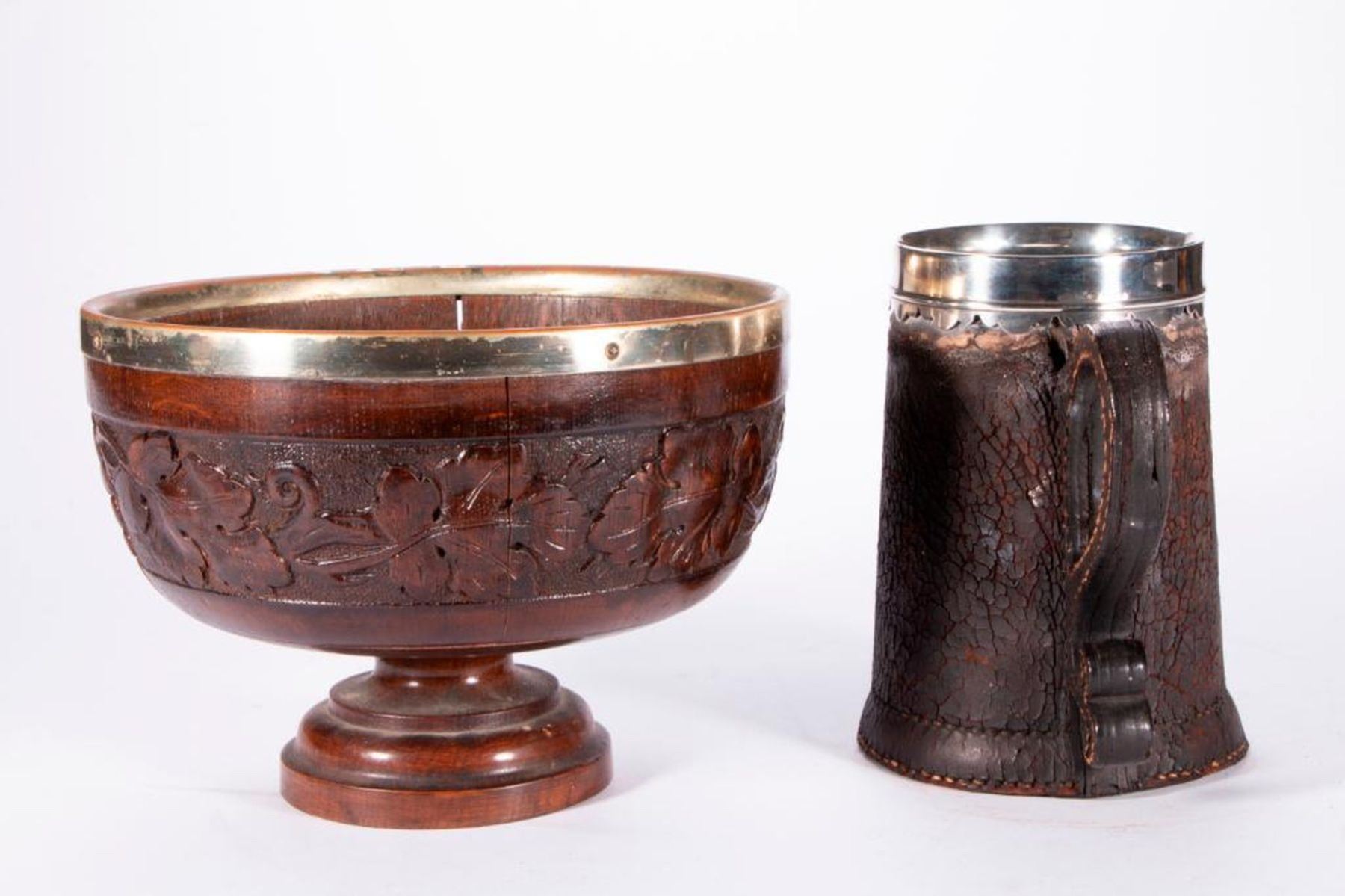 A commemorative leather and sterling mug dated 1904 measuring 7 1/2 inches high, and a late 19th /early 20th century carved and footed bowl measuring 6 1/2 inches high x 9 1/2 diameter.