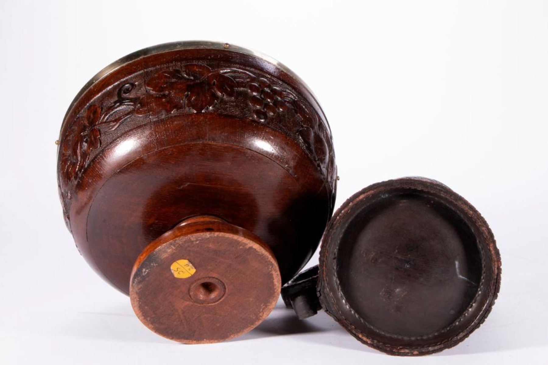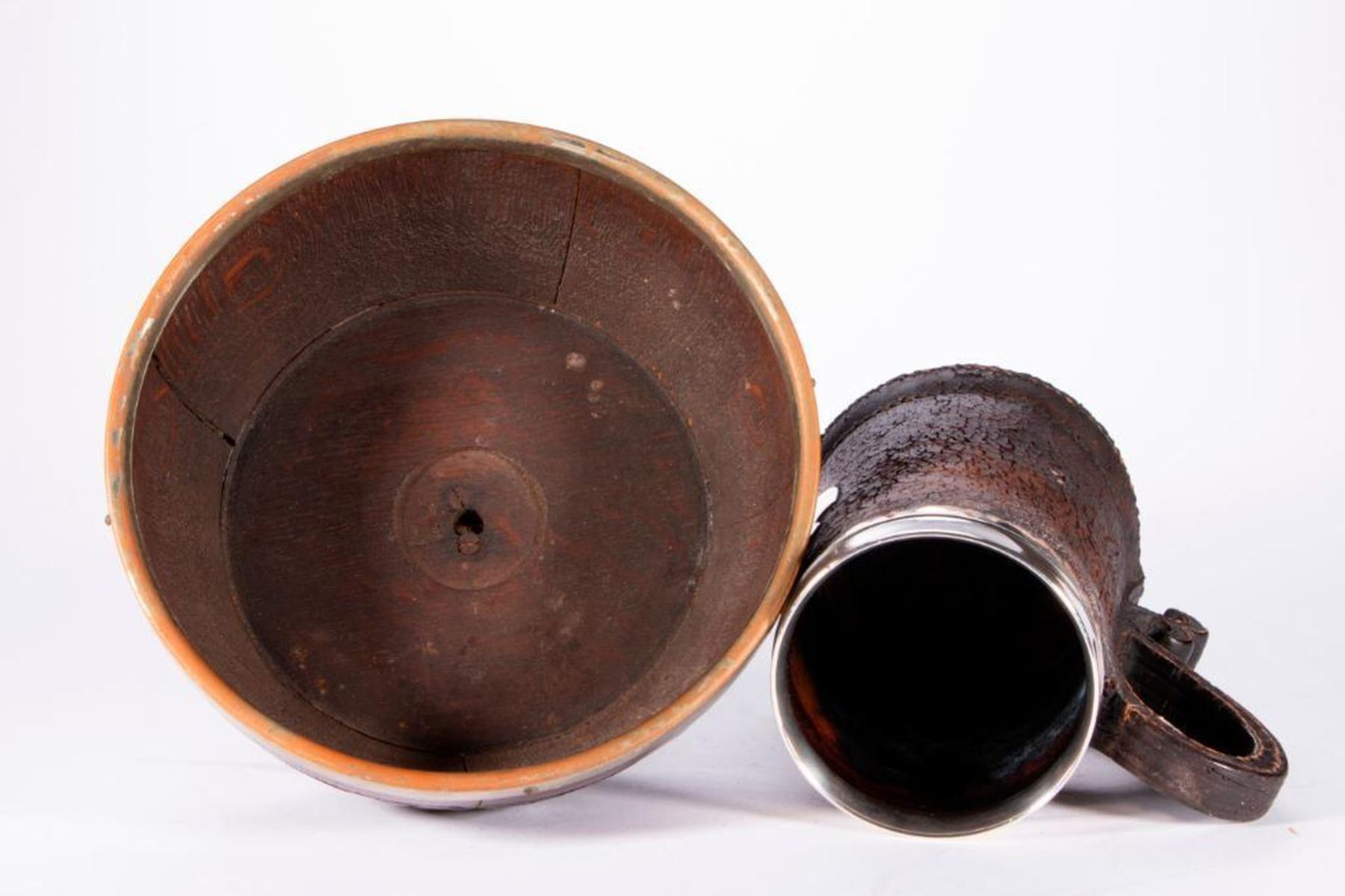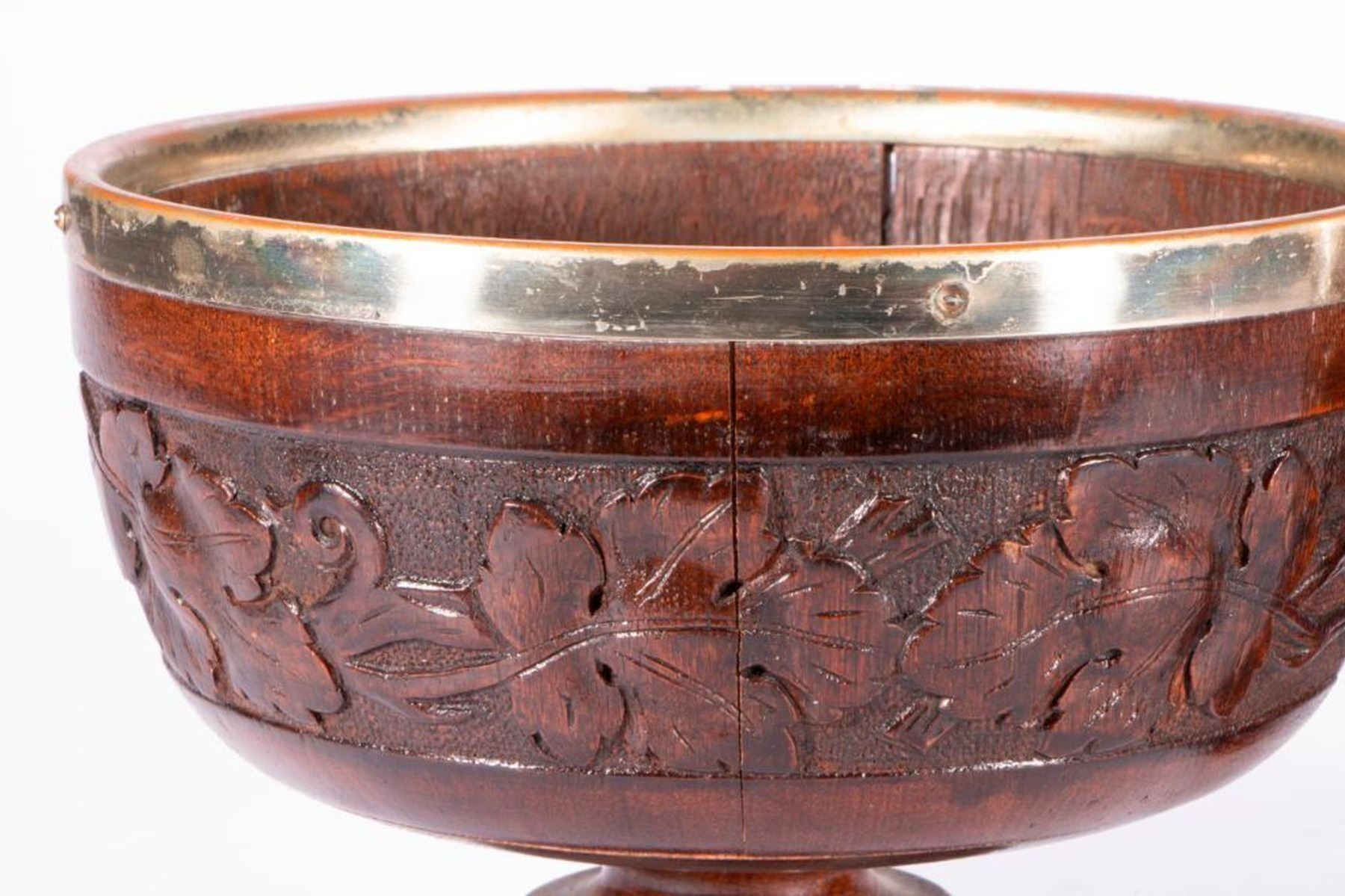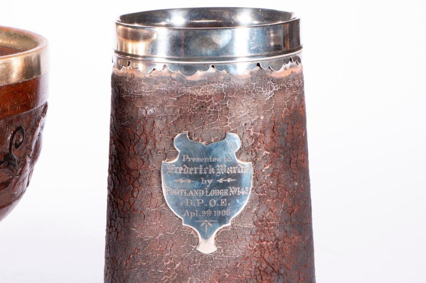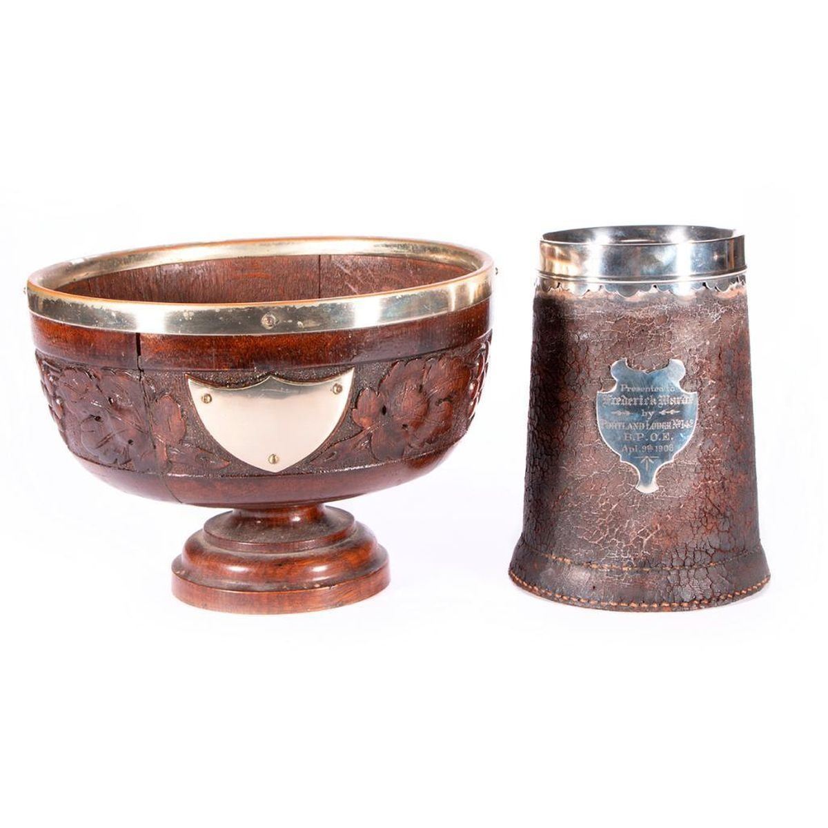A commemorative leather and sterling mug dated 1904 measuring 7 1/2 inches high, and a late 19th /early 20th century carved and footed bowl measuring 6 1/2 inches high x 9 1/2 diameter.