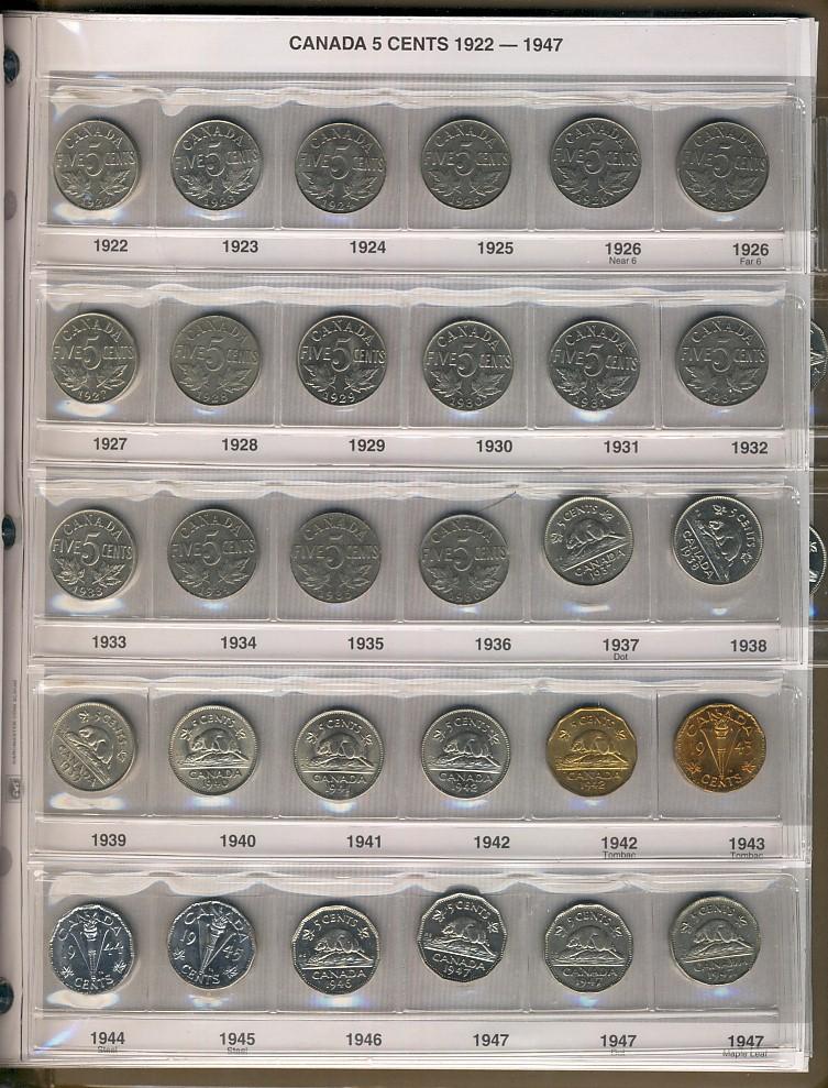 A complete collection of Five Cent NICKEL. 1922 to 2002. Includes scarcer dates such as the 1925, 1926 Far 6, 1964 EWL. Grades vary from VF to PL-65. A nice set. Should be viewed.