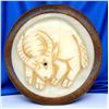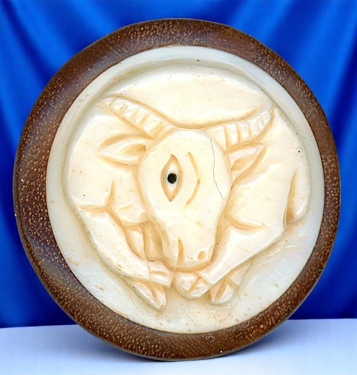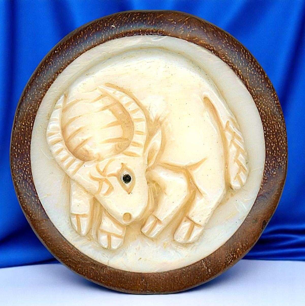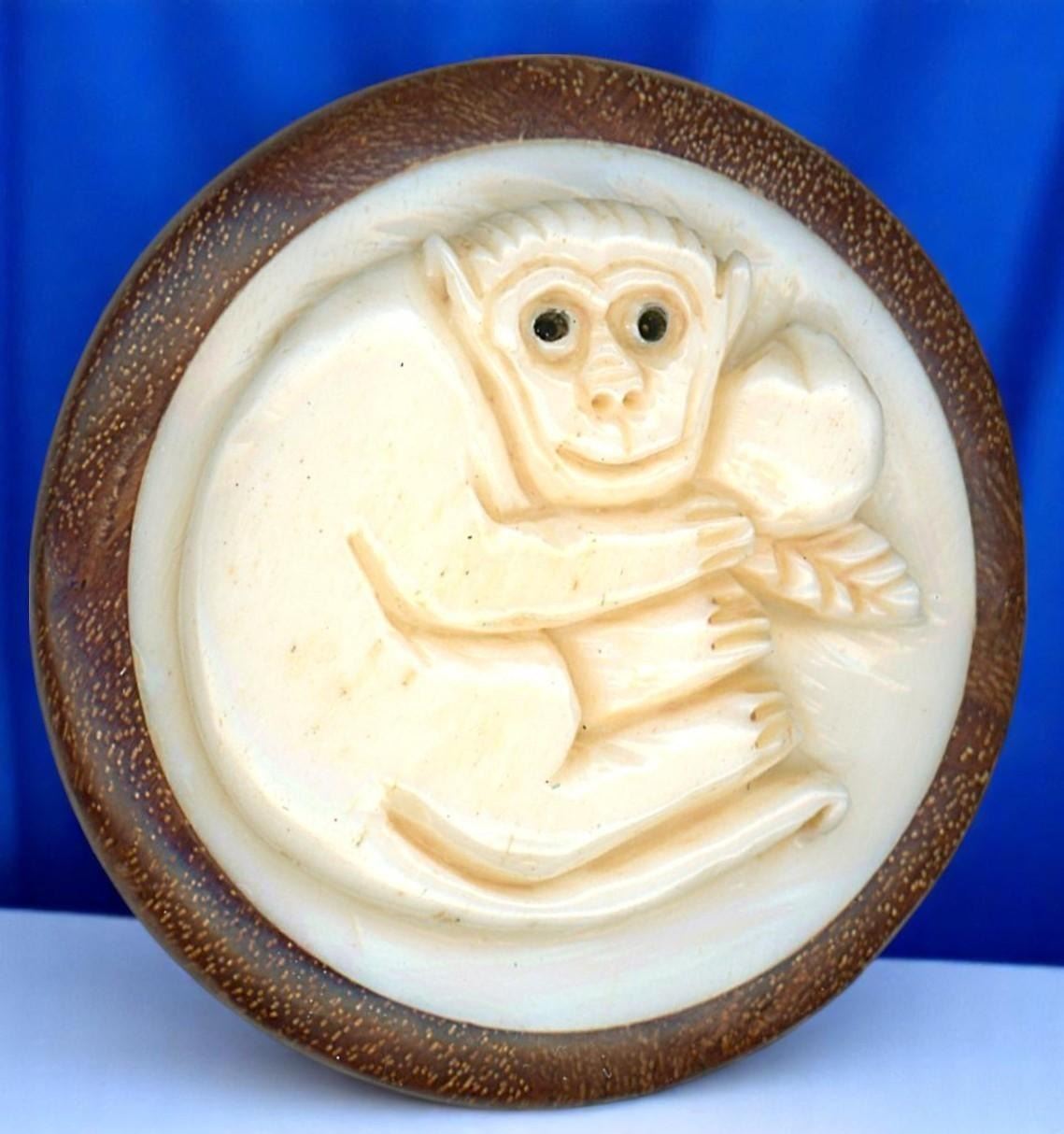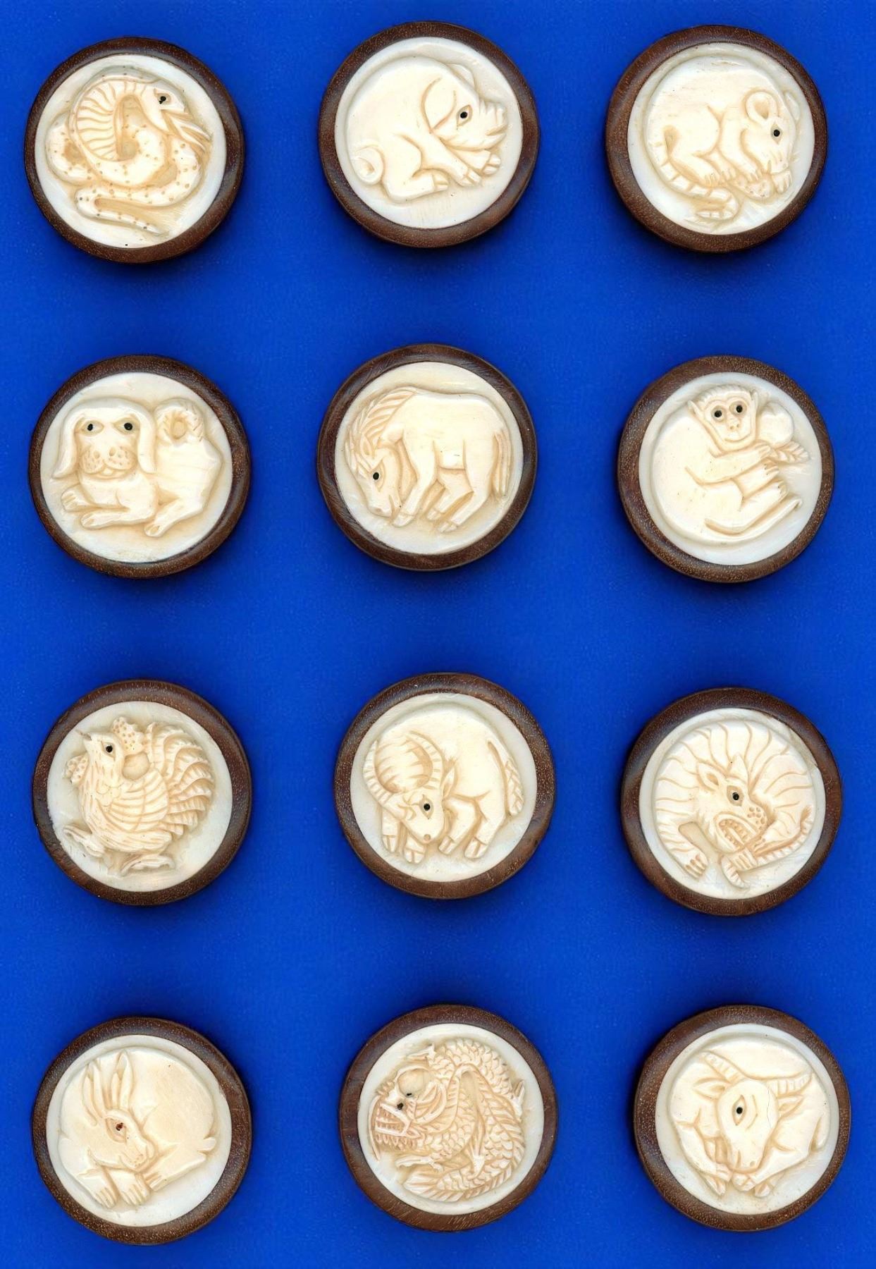 12 Large 21st century carved natural material animal examples. This card includes all 12 different animal buttons symbolizing the Asian Zodiac animal signs of the years. This set the natural material disks are set into a wood base. Nice set.