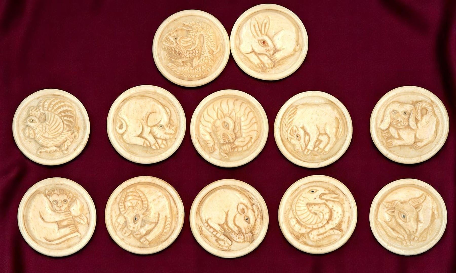 12 Large 21st century carved natural material animal examples. This card includes all 12 different animal buttons symbolizing the Asian Zodiac animal signs of the years. Nice set.