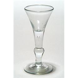 A composite-stemmed wine glass, of drawn trumpet form, the plain stem with tear inclusion above an inverted baluster lower section, on a conical foot, 15cm high, circa 1740