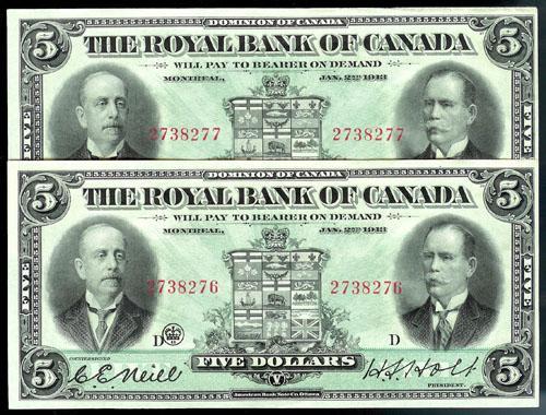 A consecutive pair of the Royal Bank of Canada 630-12-04 1913 $5. Both are original uncirculated. 2738265 and 266.