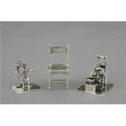 A continental silver miniature figure of a child seated in a chair preparing waffles, 1.5in high, stamped 925; a silver miniature of an early 18th century gentleman with hawk, 2.75in high, stamped Sterling 1925; etc
